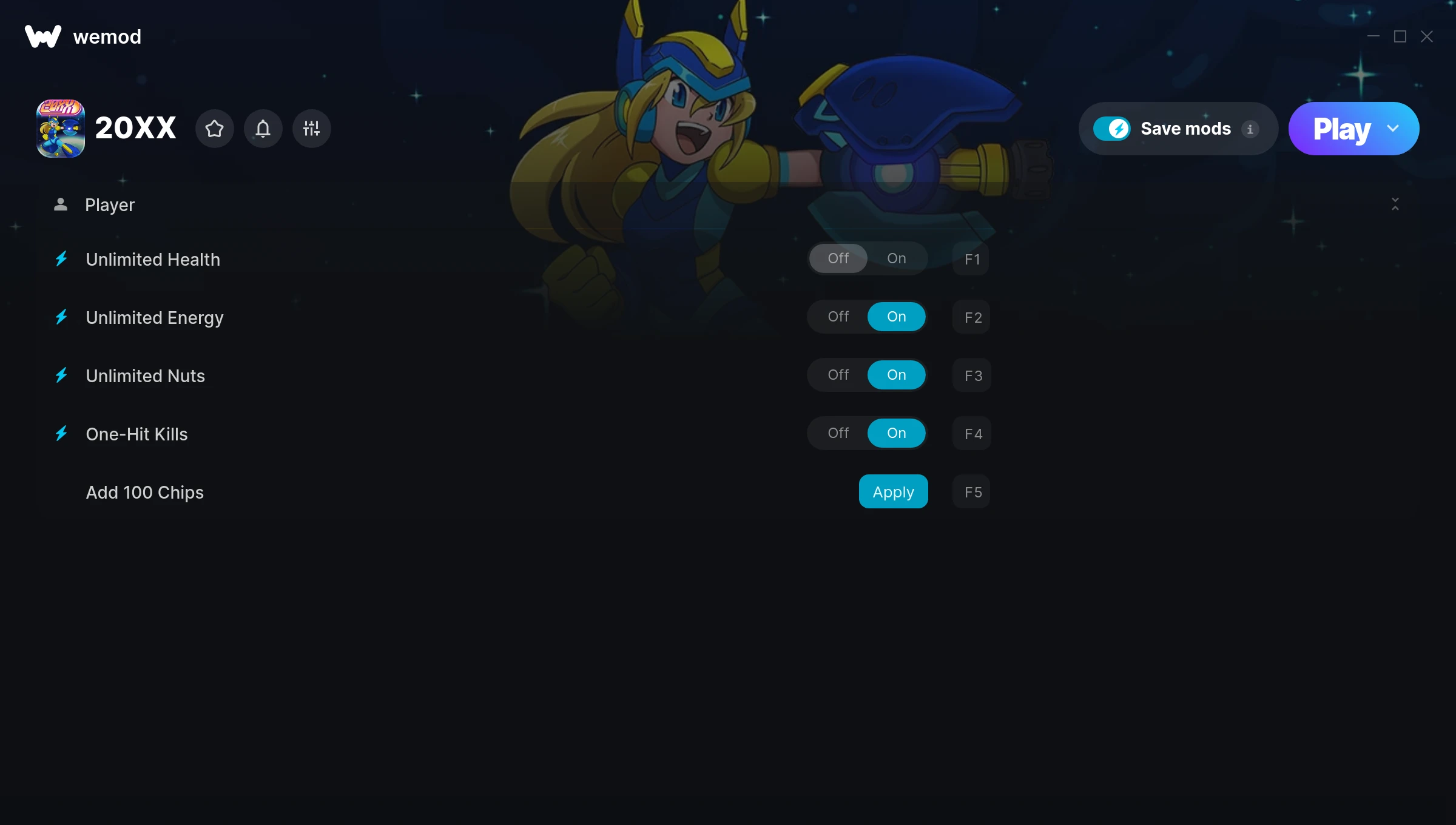 How do I use the cheats in 20XX?WeMod will safely display all of the games on your PC. Open a game from the list and simply press play. After the game loads and once you’re in-game, you can start enabling different cheats!Will this work with my game version?WeMod uses advanced technology to detect the game version you’re running and will let you know if it’s supported. If it’s not, you will still have the option of giving it a try or requesting an update!