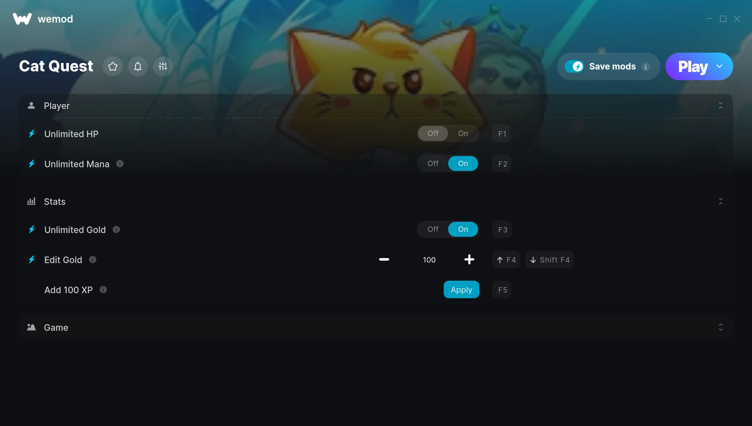 How do I use the cheats in Cat Quest?WeMod will safely display all of the games on your PC. Open a game from the list and simply press play. After the game loads and once you’re in-game, you can start enabling different cheats!Will this work with my game version?WeMod uses advanced technology to detect the game version you’re running and will let you know if it’s supported. If it’s not, you will still have the option of giving it a try or requesting an update!