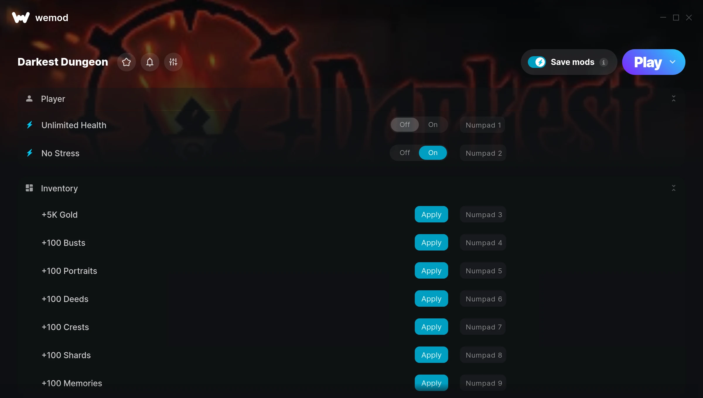 How do I use the cheats in Darkest Dungeon?WeMod will safely display all of the games on your PC. Open a game from the list and simply press play. After the game loads and once you’re in-game, you can start enabling different cheats!Will this work with my game version?WeMod uses advanced technology to detect the game version you’re running and will let you know if it’s supported. If it’s not, you will still have the option of giving it a try or requesting an update!