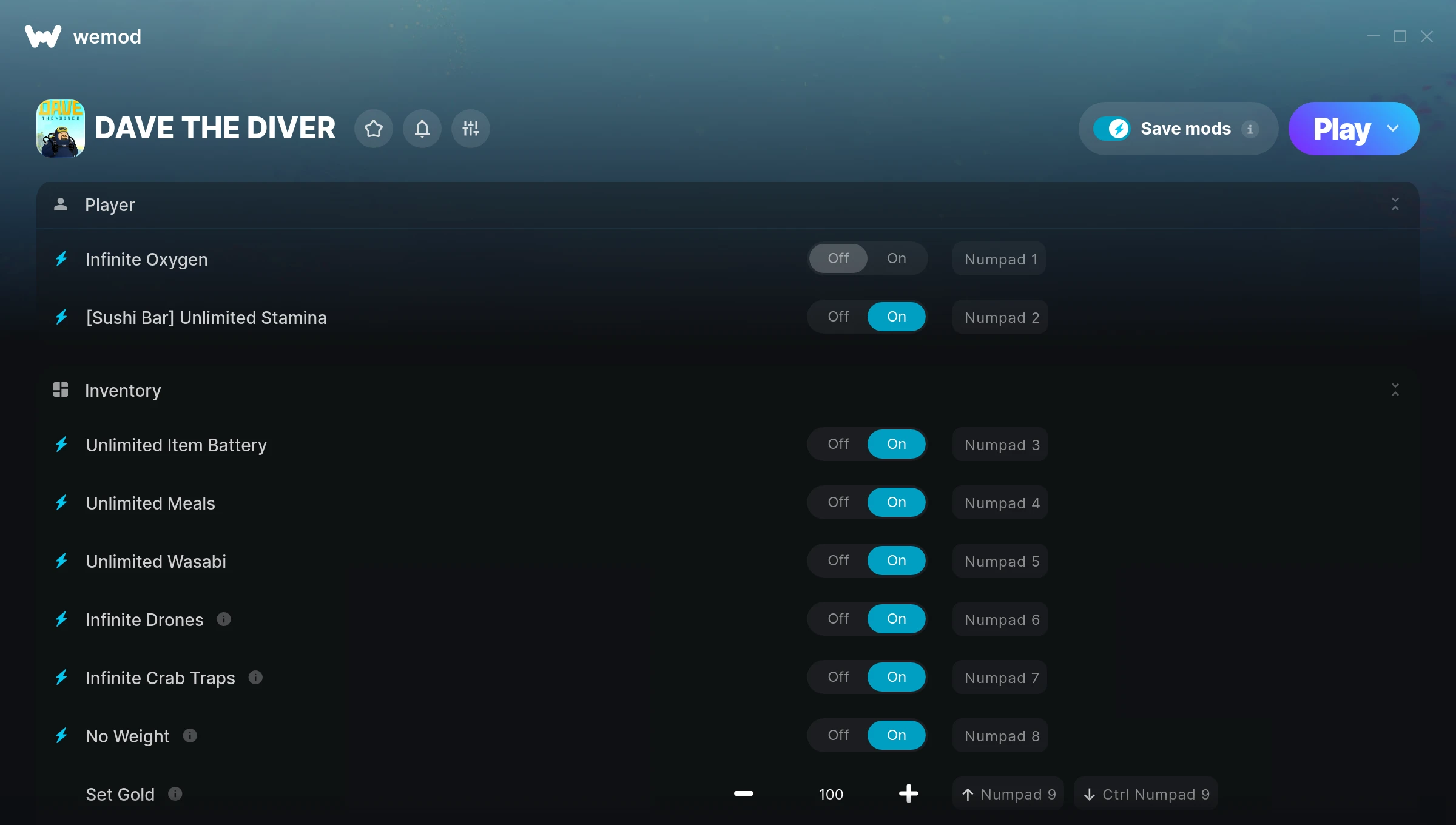 How do I use the cheats in DAVE THE DIVER?WeMod will safely display all of the games on your PC. Open a game from the list and simply press play. After the game loads and once you’re in-game, you can start enabling different cheats!Will this work with my game version?WeMod uses advanced technology to detect the game version you’re running and will let you know if it’s supported. If it’s not, you will still have the option of giving it a try or requesting an update!