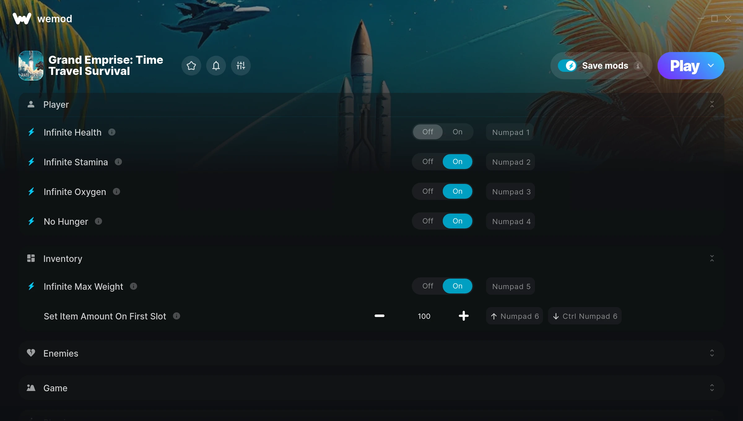 How do I use the cheats in Grand Emprise: Time Travel Survival?WeMod will safely display all of the games on your PC. Open a game from the list and simply press play. After the game loads and once you’re in-game, you can start enabling different cheats!Will this work with my game version?WeMod uses advanced technology to detect the game version you’re running and will let you know if it’s supported. If it’s not, you will still have the option of giving it a try or requesting an update!