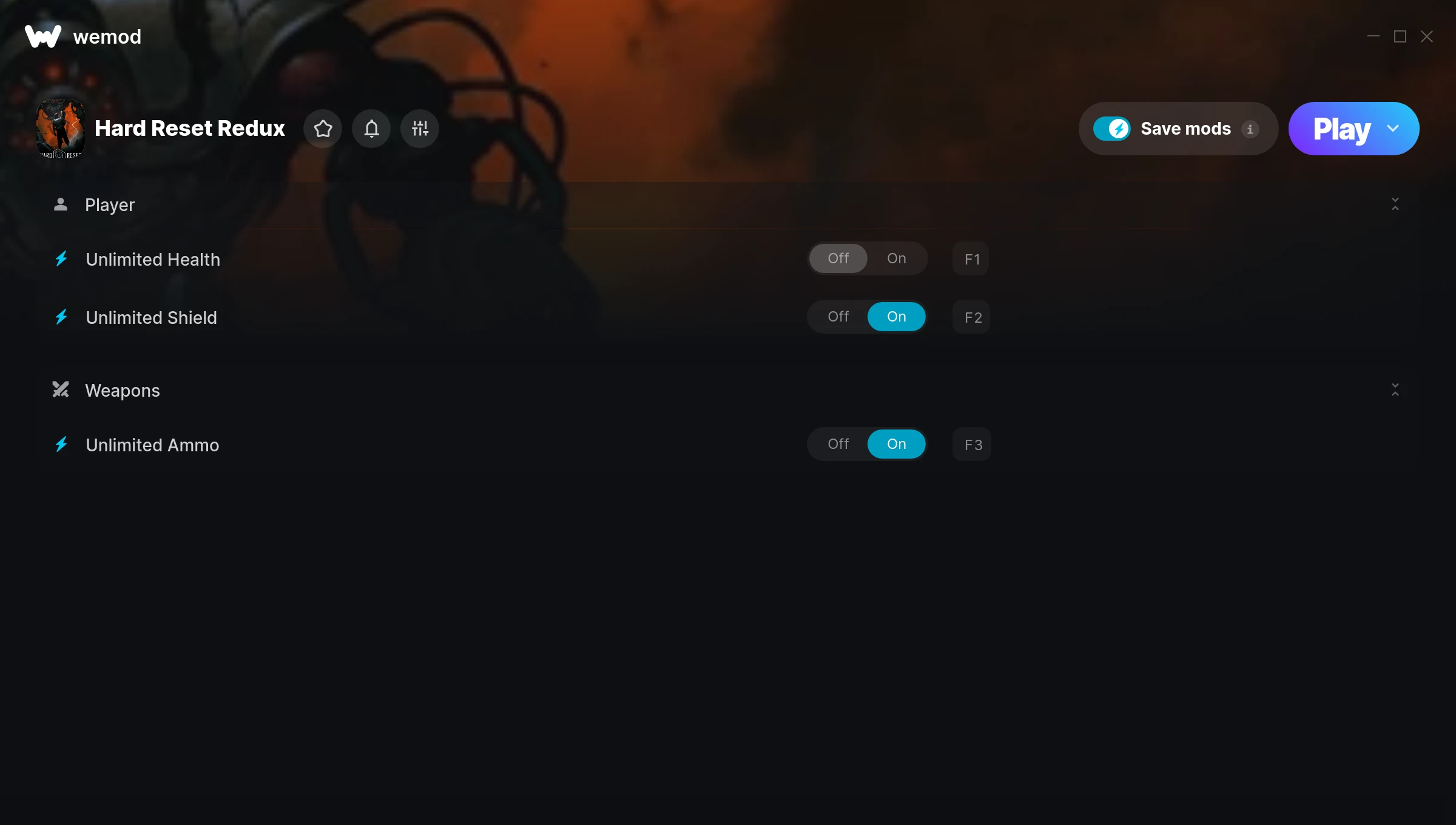 How do I use the cheats in Hard Reset Redux?WeMod will safely display all of the games on your PC. Open a game from the list and simply press play. After the game loads and once you’re in-game, you can start enabling different cheats!Will this work with my game version?WeMod uses advanced technology to detect the game version you’re running and will let you know if it’s supported. If it’s not, you will still have the option of giving it a try or requesting an update!