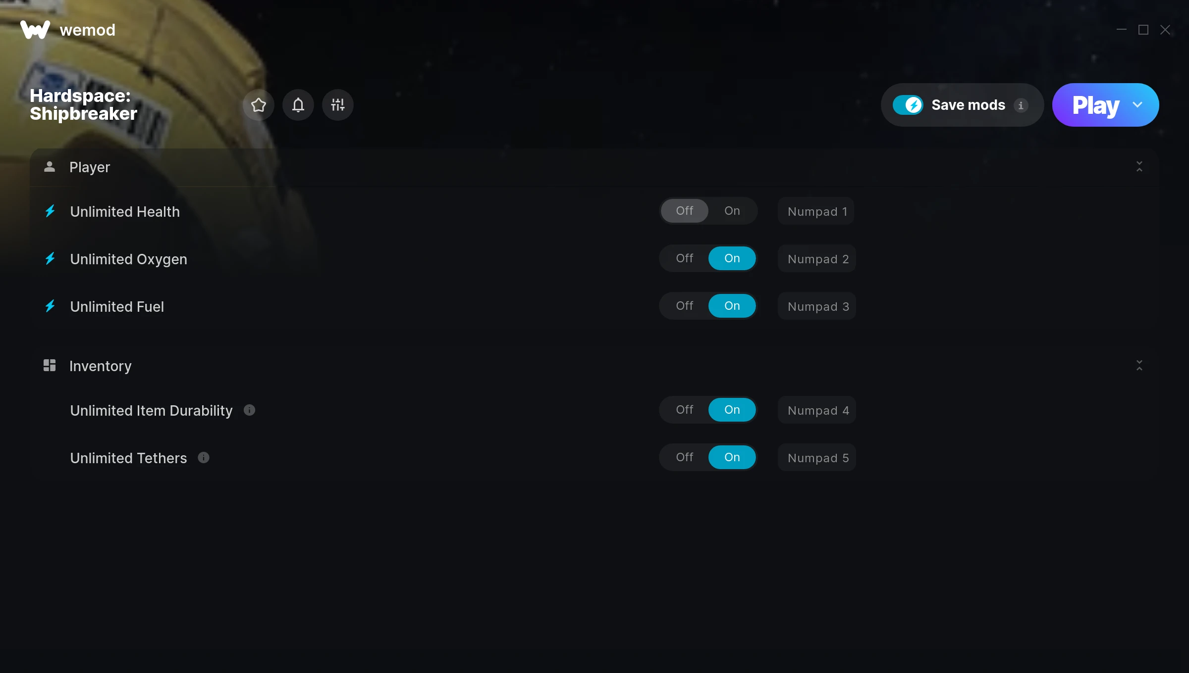 How do I use the cheats in Hardspace: Shipbreaker?WeMod will safely display all of the games on your PC. Open a game from the list and simply press play. After the game loads and once you’re in-game, you can start enabling different cheats!Will this work with my game version?WeMod uses advanced technology to detect the game version you’re running and will let you know if it’s supported. If it’s not, you will still have the option of giving it a try or requesting an update!