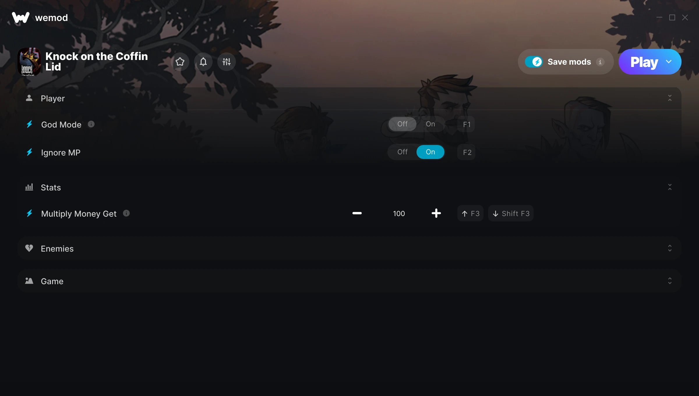 How do I use the cheats in Knock on the Coffin Lid?WeMod will safely display all of the games on your PC. Open a game from the list and simply press play. After the game loads and once you’re in-game, you can start enabling different cheats!Will this work with my game version?WeMod uses advanced technology to detect the game version you’re running and will let you know if it’s supported. If it’s not, you will still have the option of giving it a try or requesting an update!