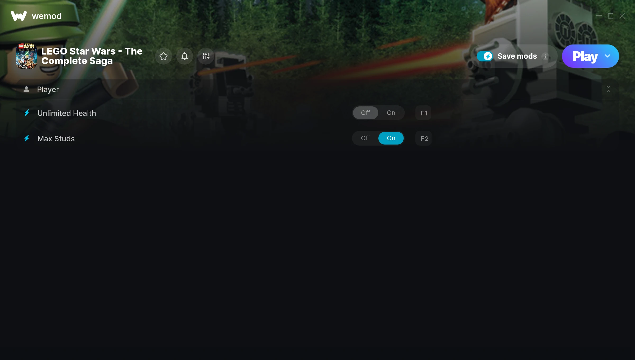 How do I use the cheats in LEGO Star Wars - The Complete Saga?WeMod will safely display all of the games on your PC. Open a game from the list and simply press play. After the game loads and once you’re in-game, you can start enabling different cheats!Will this work with my game version?WeMod uses advanced technology to detect the game version you’re running and will let you know if it’s supported. If it’s not, you will still have the option of giving it a try or requesting an update!