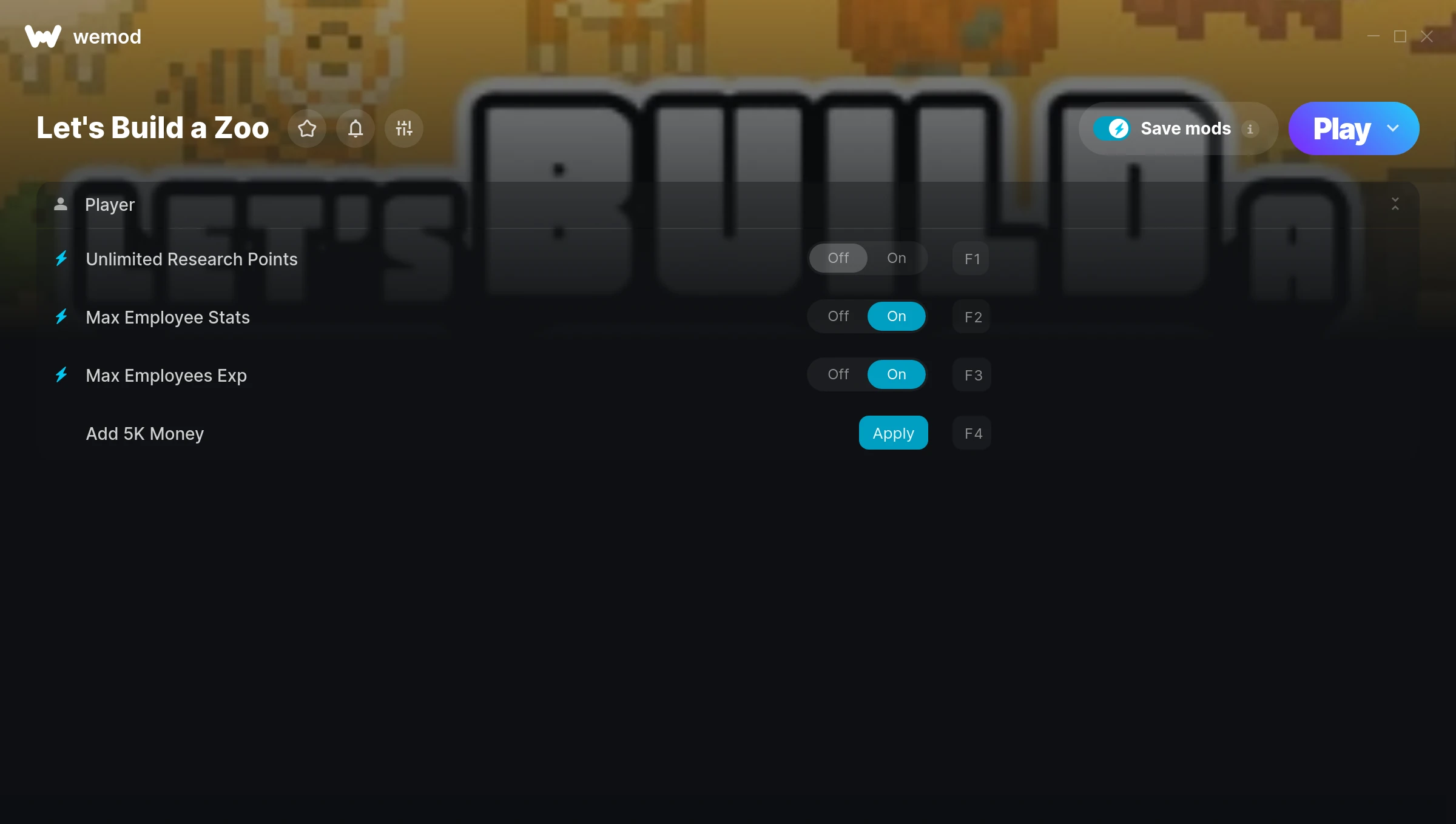 How do I use the cheats in Let's Build a Zoo?WeMod will safely display all of the games on your PC. Open a game from the list and simply press play. After the game loads and once you’re in-game, you can start enabling different cheats!Will this work with my game version?WeMod uses advanced technology to detect the game version you’re running and will let you know if it’s supported. If it’s not, you will still have the option of giving it a try or requesting an update!