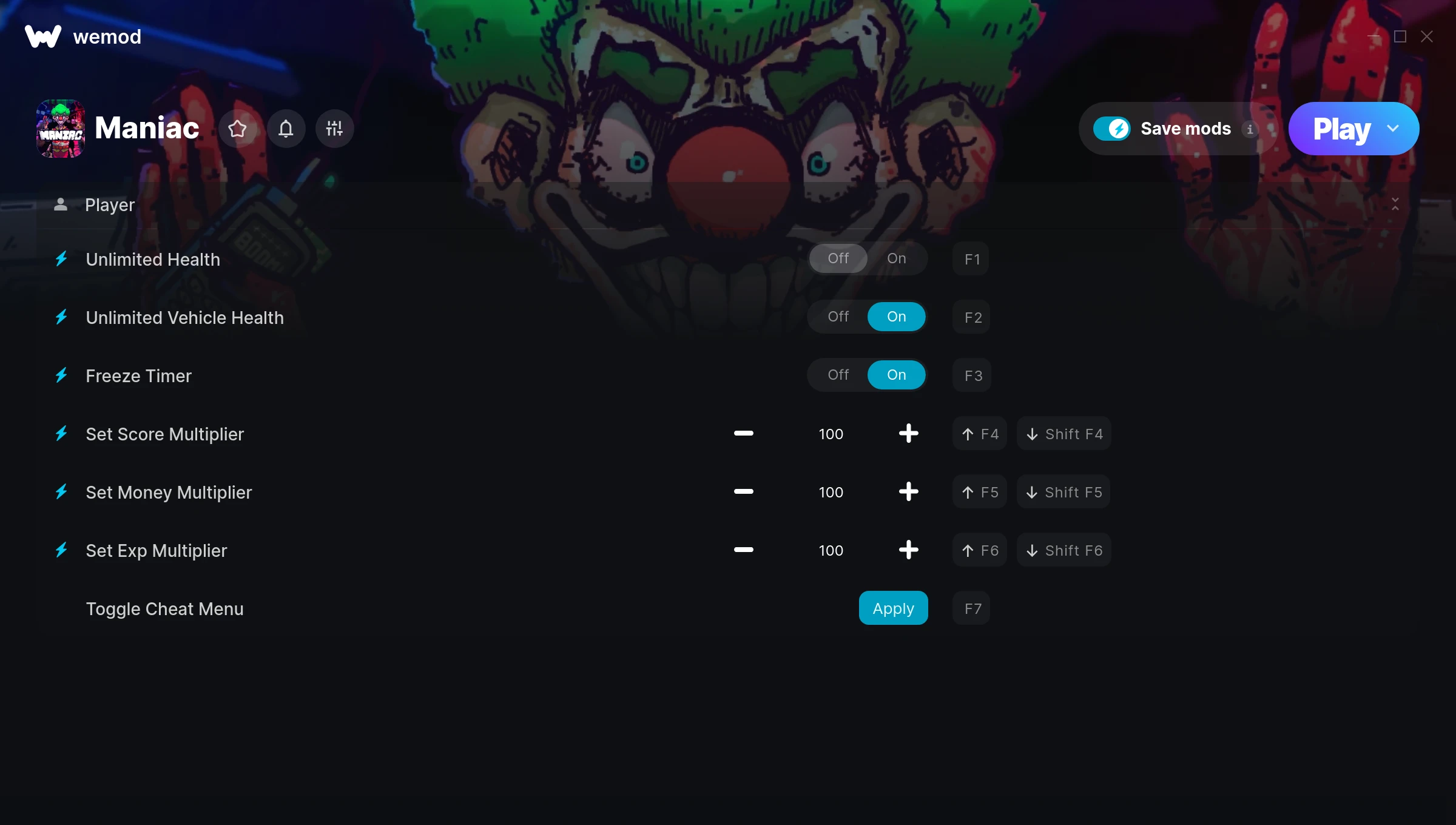 How do I use the cheats in Maniac?WeMod will safely display all of the games on your PC. Open a game from the list and simply press play. After the game loads and once you’re in-game, you can start enabling different cheats!Will this work with my game version?WeMod uses advanced technology to detect the game version you’re running and will let you know if it’s supported. If it’s not, you will still have the option of giving it a try or requesting an update!