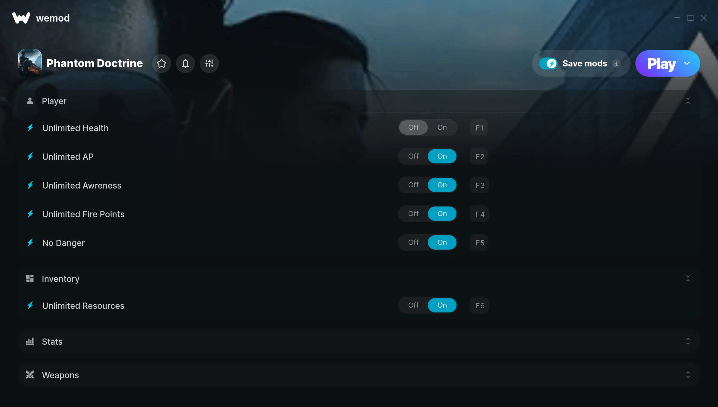 How do I use the cheats in Phantom Doctrine?WeMod will safely display all of the games on your PC. Open a game from the list and simply press play. After the game loads and once you’re in-game, you can start enabling different cheats!Will this work with my game version?WeMod uses advanced technology to detect the game version you’re running and will let you know if it’s supported. If it’s not, you will still have the option of giving it a try or requesting an update!