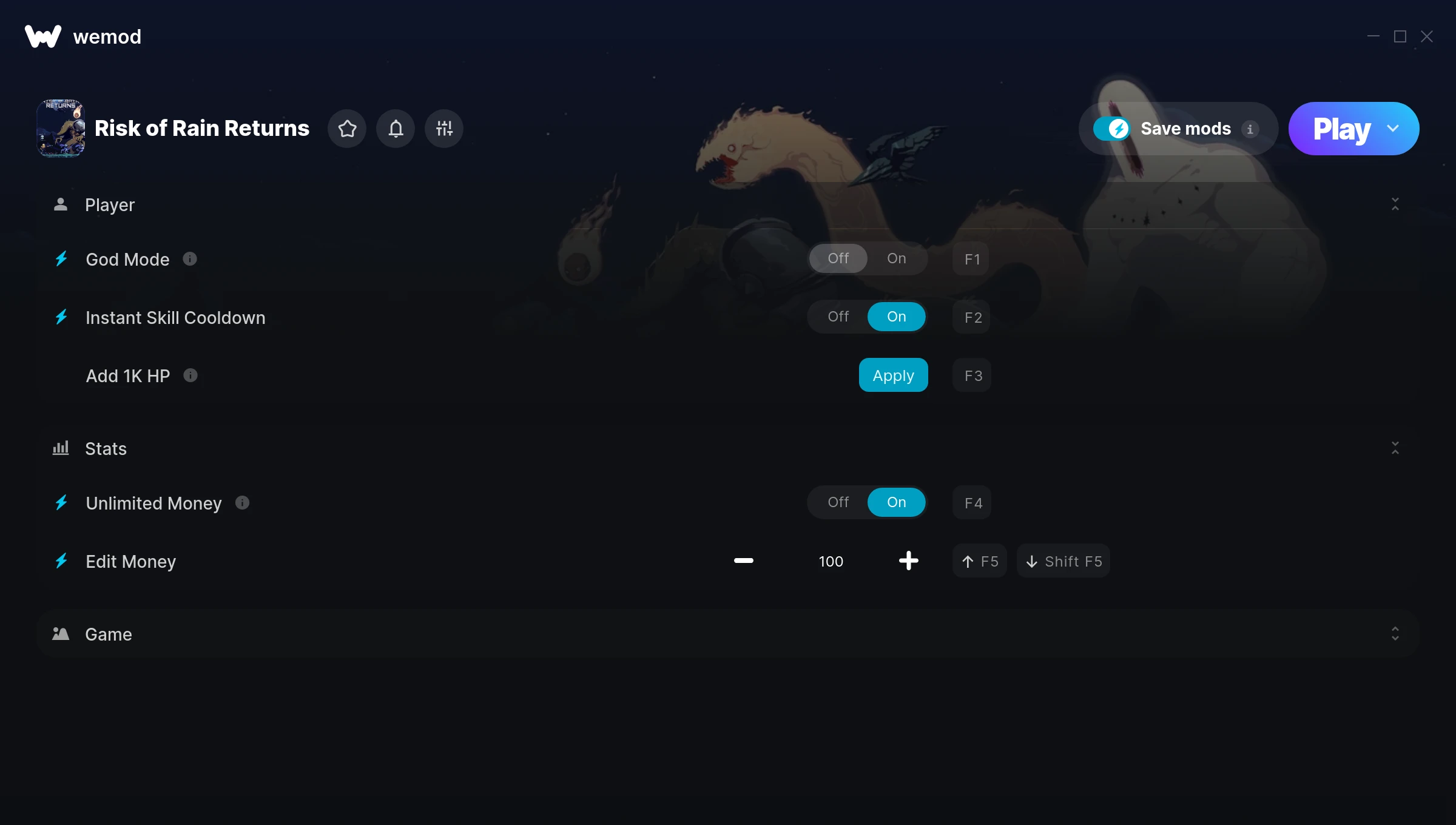 How do I use the cheats in Risk of Rain Returns?WeMod will safely display all of the games on your PC. Open a game from the list and simply press play. After the game loads and once you’re in-game, you can start enabling different cheats!Will this work with my game version?WeMod uses advanced technology to detect the game version you’re running and will let you know if it’s supported. If it’s not, you will still have the option of giving it a try or requesting an update!