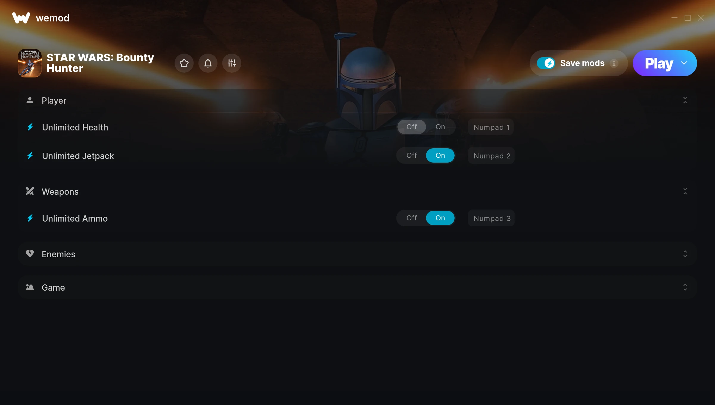 How do I use the cheats in STAR WARS: Bounty Hunter?WeMod will safely display all of the games on your PC. Open a game from the list and simply press play. After the game loads and once you’re in-game, you can start enabling different cheats!Will this work with my game version?WeMod uses advanced technology to detect the game version you’re running and will let you know if it’s supported. If it’s not, you will still have the option of giving it a try or requesting an update!
