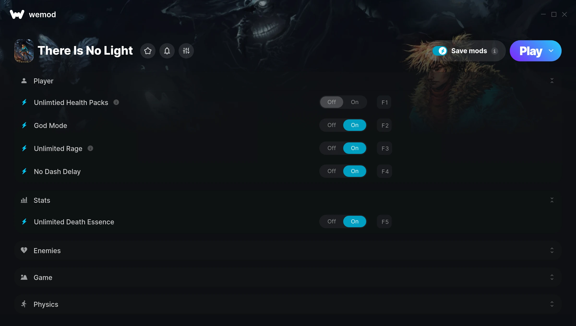 How do I use the cheats in There Is No Light?WeMod will safely display all of the games on your PC. Open a game from the list and simply press play. After the game loads and once you’re in-game, you can start enabling different cheats!Will this work with my game version?WeMod uses advanced technology to detect the game version you’re running and will let you know if it’s supported. If it’s not, you will still have the option of giving it a try or requesting an update!