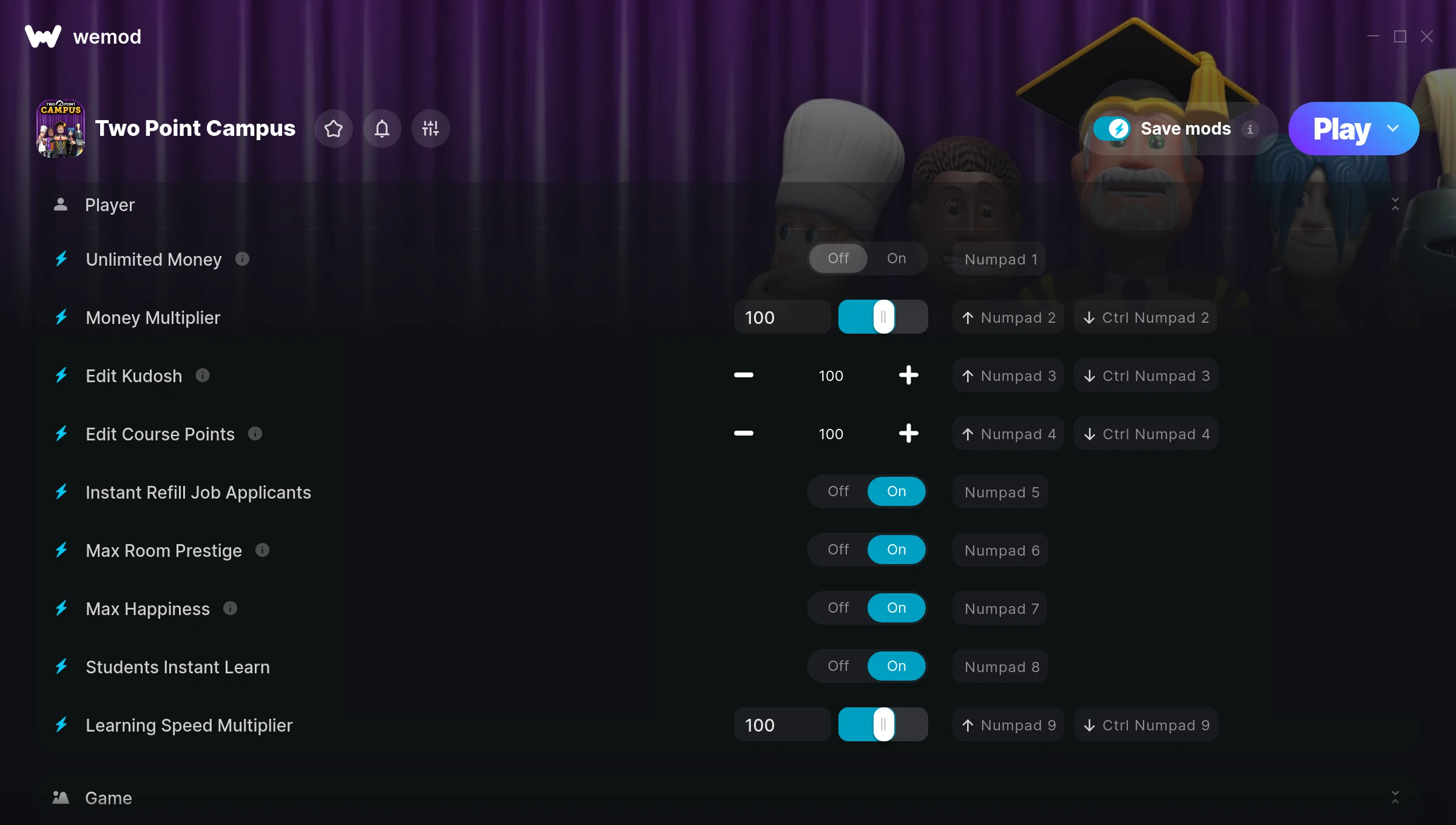 How do I use the cheats in Two Point Campus?WeMod will safely display all of the games on your PC. Open a game from the list and simply press play. After the game loads and once you’re in-game, you can start enabling different cheats!Will this work with my game version?WeMod uses advanced technology to detect the game version you’re running and will let you know if it’s supported. If it’s not, you will still have the option of giving it a try or requesting an update!