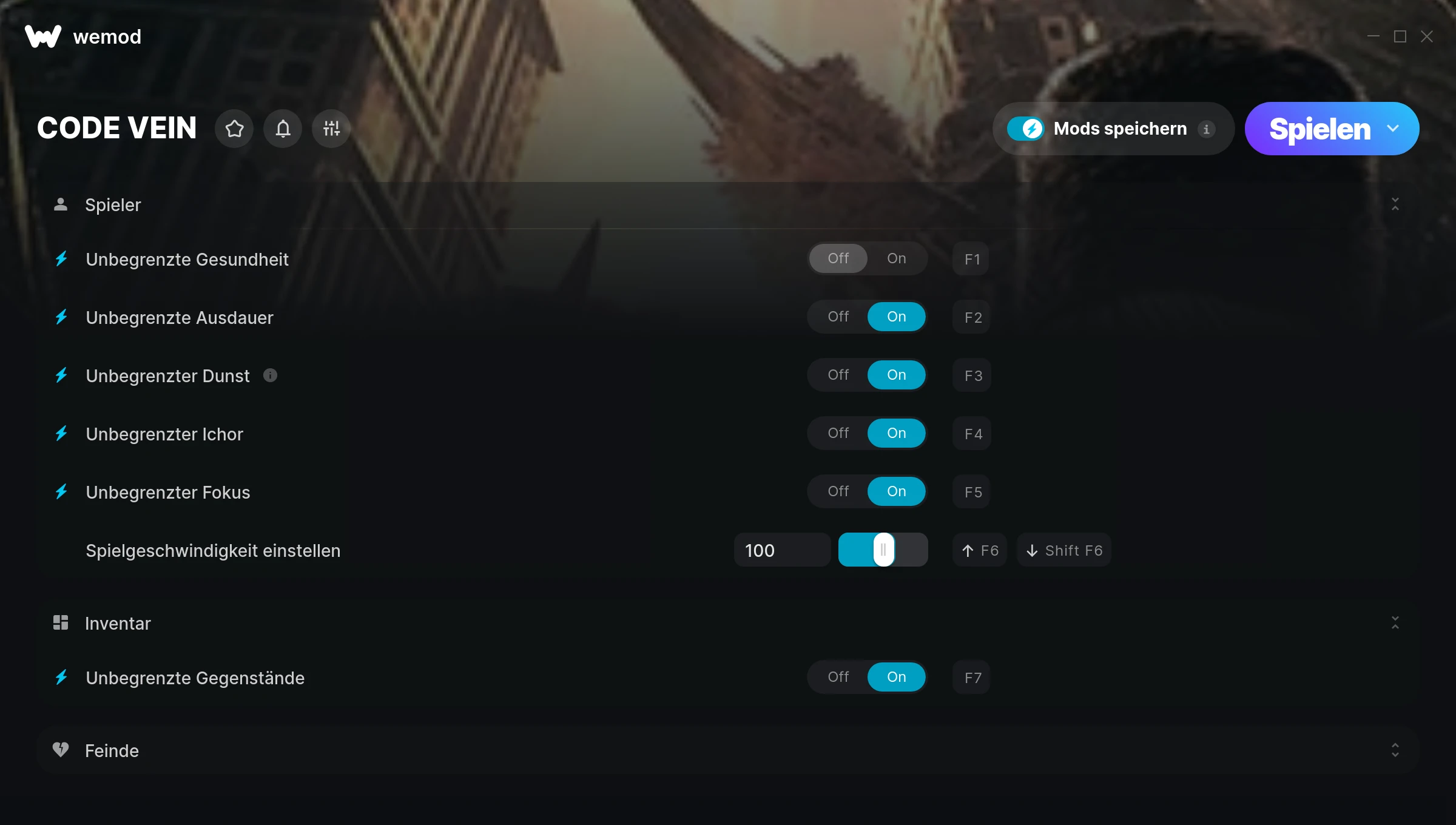 How do I use the cheats in CODE VEIN?WeMod will safely display all of the games on your PC. Open a game from the list and simply press play. After the game loads and once you’re in-game, you can start enabling different cheats!Will this work with my game version?WeMod uses advanced technology to detect the game version you’re running and will let you know if it’s supported. If it’s not, you will still have the option of giving it a try or requesting an update!