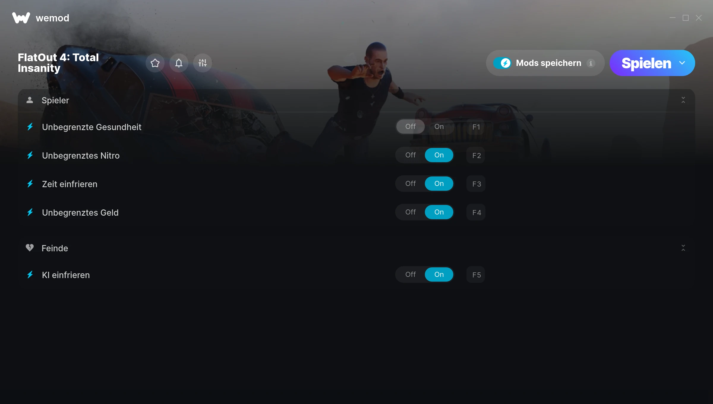 How do I use the cheats in FlatOut 4: Total Insanity?WeMod will safely display all of the games on your PC. Open a game from the list and simply press play. After the game loads and once you’re in-game, you can start enabling different cheats!Will this work with my game version?WeMod uses advanced technology to detect the game version you’re running and will let you know if it’s supported. If it’s not, you will still have the option of giving it a try or requesting an update!