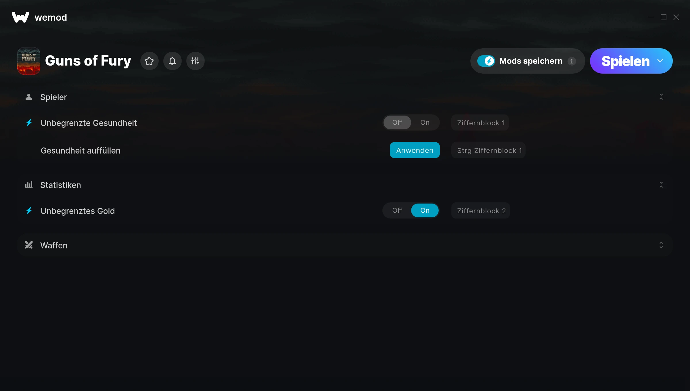 How do I use the cheats in Guns of Fury?WeMod will safely display all of the games on your PC. Open a game from the list and simply press play. After the game loads and once you’re in-game, you can start enabling different cheats!Will this work with my game version?WeMod uses advanced technology to detect the game version you’re running and will let you know if it’s supported. If it’s not, you will still have the option of giving it a try or requesting an update!