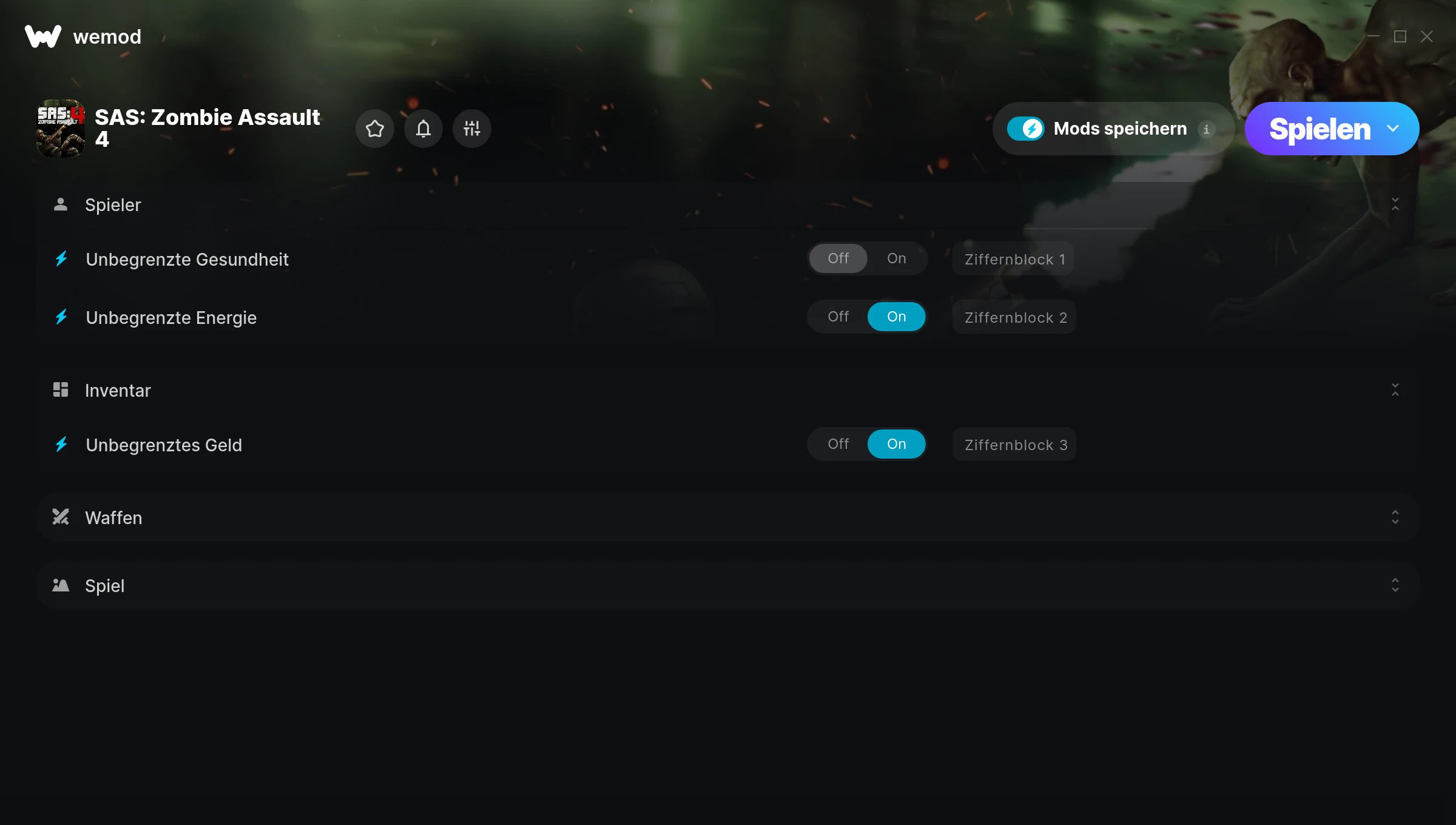How do I use the cheats in SAS: Zombie Assault 4?WeMod will safely display all of the games on your PC. Open a game from the list and simply press play. After the game loads and once you’re in-game, you can start enabling different cheats!Will this work with my game version?WeMod uses advanced technology to detect the game version you’re running and will let you know if it’s supported. If it’s not, you will still have the option of giving it a try or requesting an update!