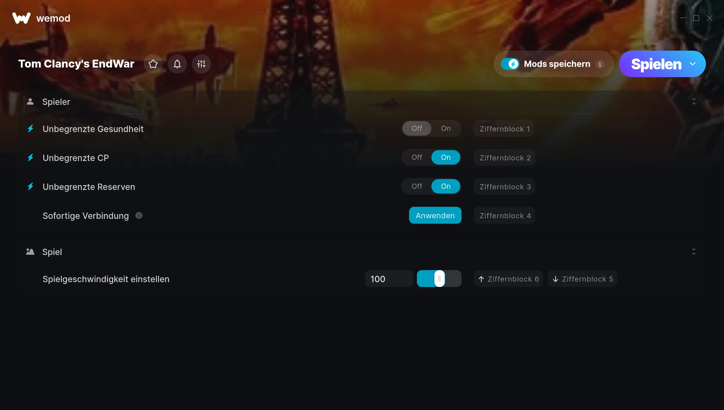 How do I use the cheats in Tom Clancy's EndWar?WeMod will safely display all of the games on your PC. Open a game from the list and simply press play. After the game loads and once you’re in-game, you can start enabling different cheats!Will this work with my game version?WeMod uses advanced technology to detect the game version you’re running and will let you know if it’s supported. If it’s not, you will still have the option of giving it a try or requesting an update!