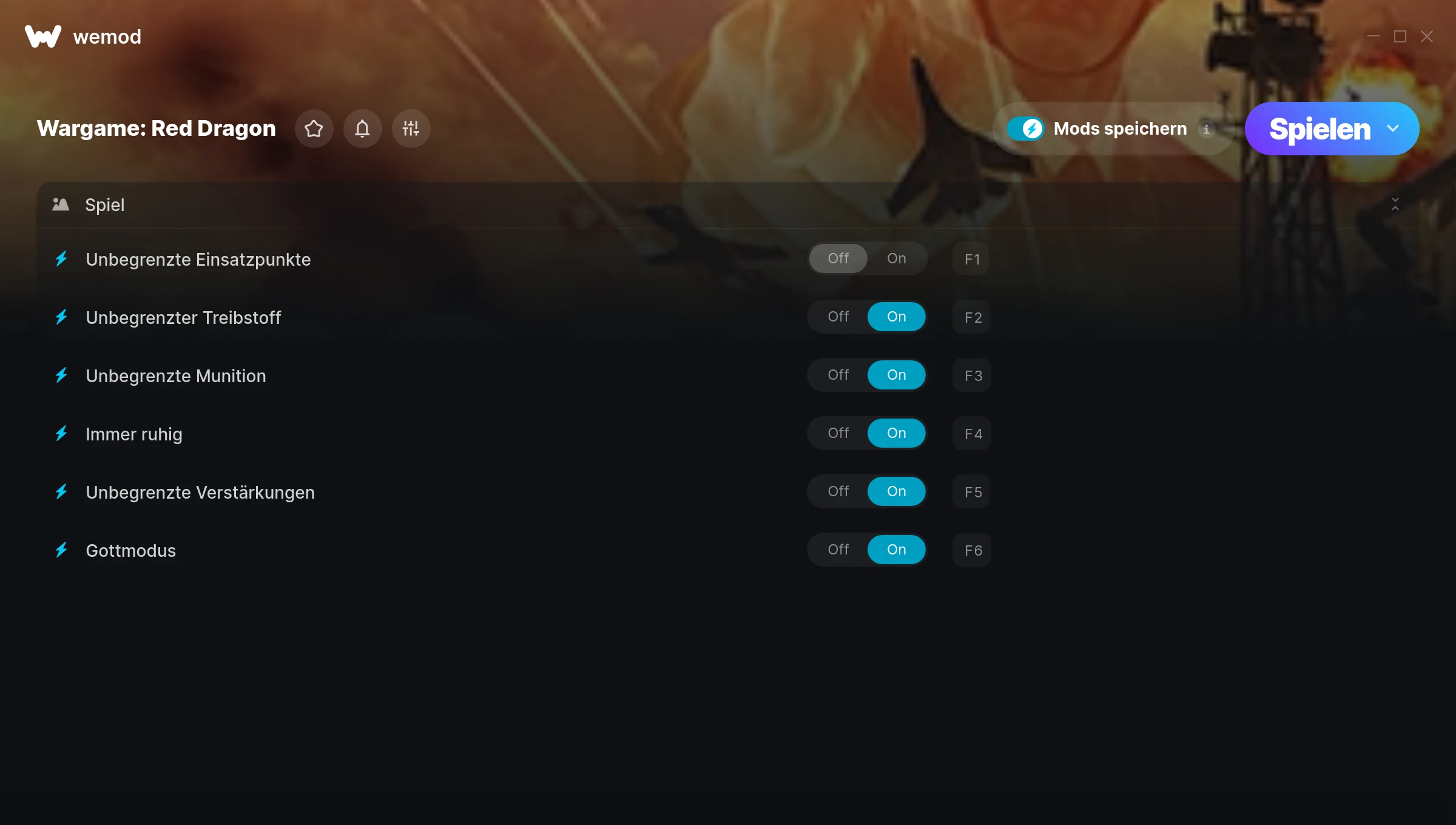 How do I use the cheats in Wargame: Red Dragon?WeMod will safely display all of the games on your PC. Open a game from the list and simply press play. After the game loads and once you’re in-game, you can start enabling different cheats!Will this work with my game version?WeMod uses advanced technology to detect the game version you’re running and will let you know if it’s supported. If it’s not, you will still have the option of giving it a try or requesting an update!
