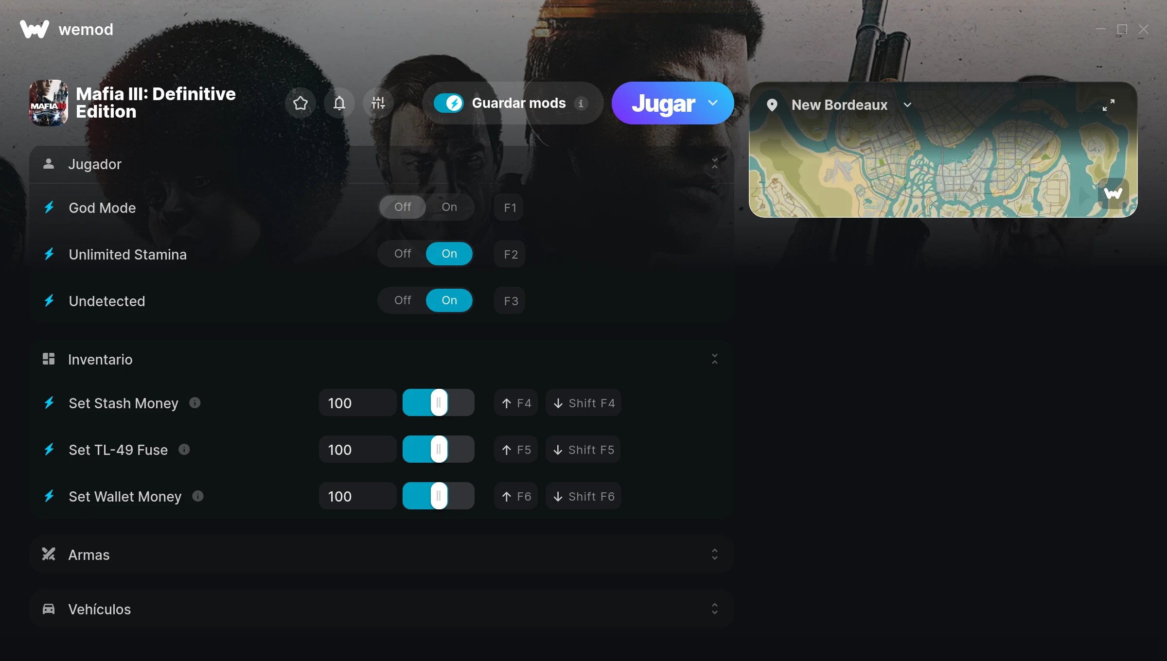 How do I use the cheats in Mafia III: Definitive Edition?WeMod will safely display all of the games on your PC. Open a game from the list and simply press play. After the game loads and once you’re in-game, you can start enabling different cheats!Will this work with my game version?WeMod uses advanced technology to detect the game version you’re running and will let you know if it’s supported. If it’s not, you will still have the option of giving it a try or requesting an update!