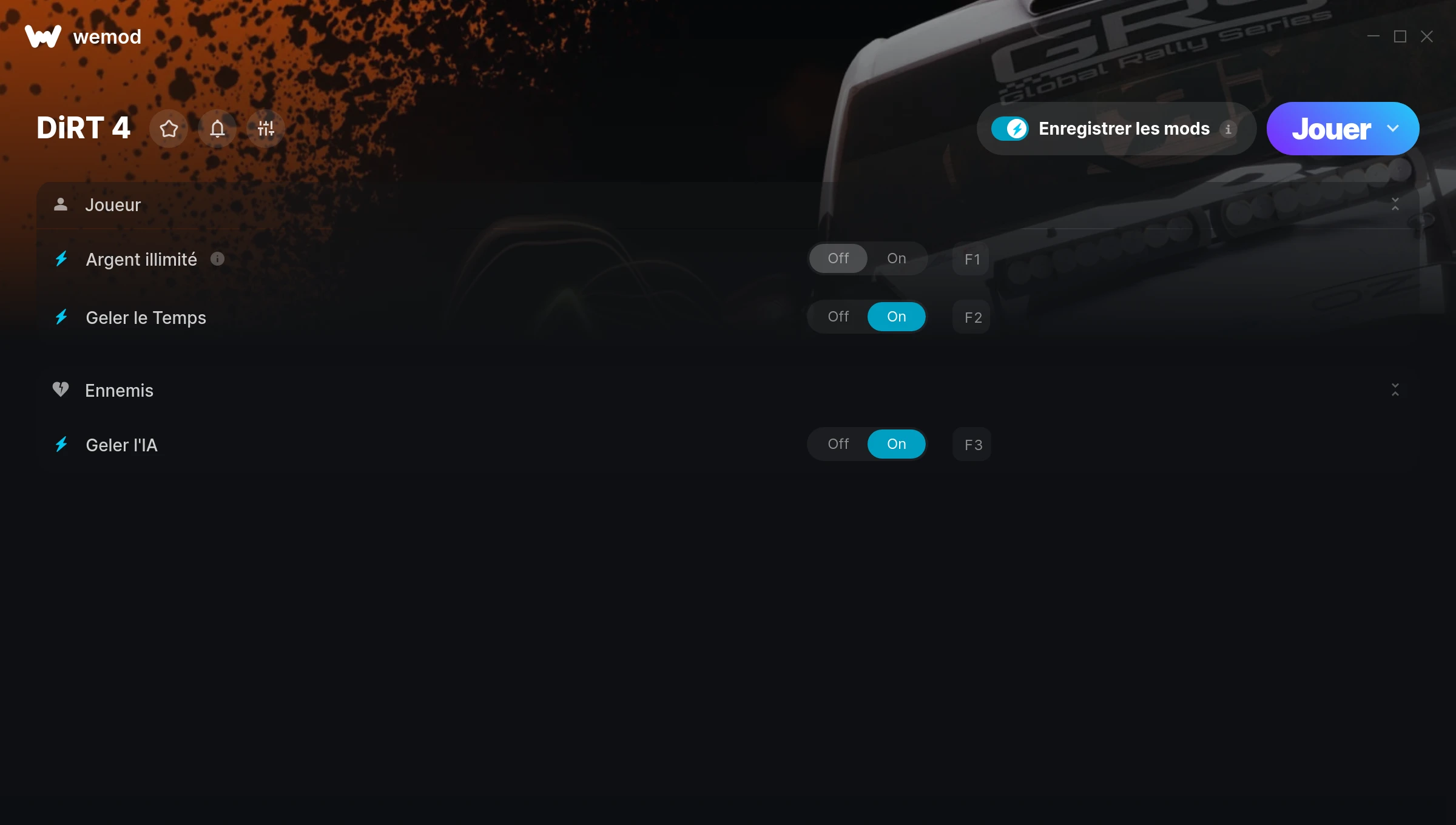 How do I use the cheats in DiRT 4?WeMod will safely display all of the games on your PC. Open a game from the list and simply press play. After the game loads and once you’re in-game, you can start enabling different cheats!Will this work with my game version?WeMod uses advanced technology to detect the game version you’re running and will let you know if it’s supported. If it’s not, you will still have the option of giving it a try or requesting an update!