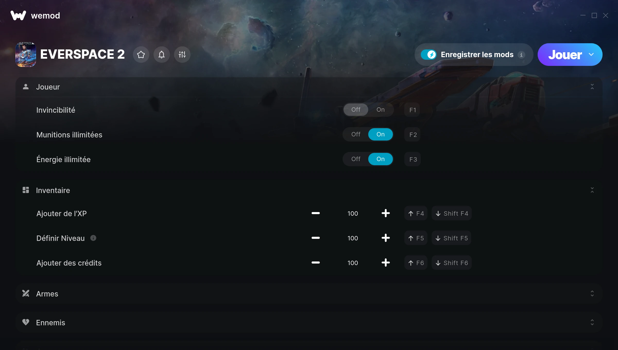 How do I use the cheats in EVERSPACE 2?WeMod will safely display all of the games on your PC. Open a game from the list and simply press play. After the game loads and once you’re in-game, you can start enabling different cheats!Will this work with my game version?WeMod uses advanced technology to detect the game version you’re running and will let you know if it’s supported. If it’s not, you will still have the option of giving it a try or requesting an update!