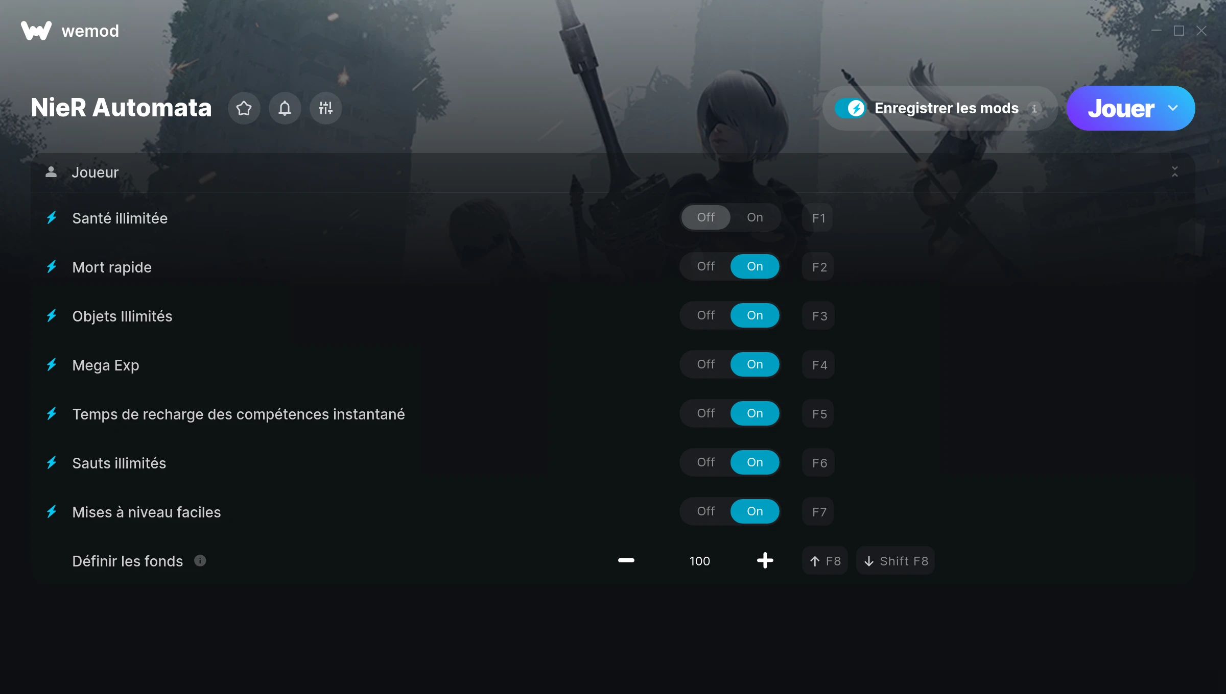 How do I use the cheats in NieR Automata?WeMod will safely display all of the games on your PC. Open a game from the list and simply press play. After the game loads and once you’re in-game, you can start enabling different cheats!Will this work with my game version?WeMod uses advanced technology to detect the game version you’re running and will let you know if it’s supported. If it’s not, you will still have the option of giving it a try or requesting an update!