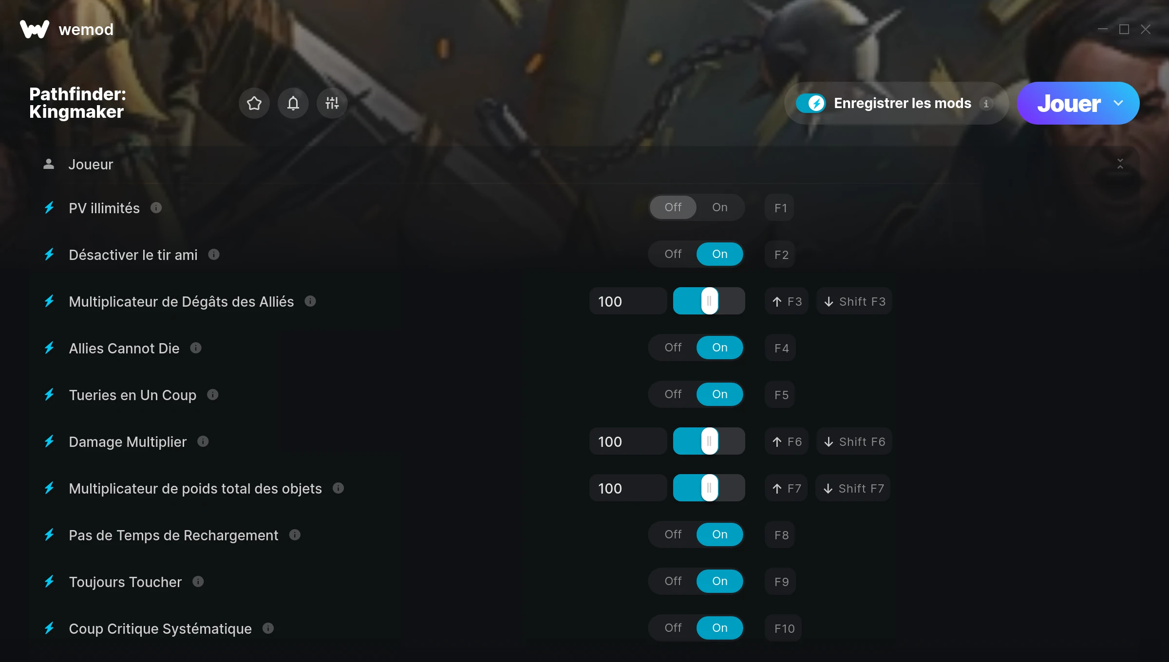 How do I use the cheats in Pathfinder: Kingmaker?WeMod will safely display all of the games on your PC. Open a game from the list and simply press play. After the game loads and once you’re in-game, you can start enabling different cheats!Will this work with my game version?WeMod uses advanced technology to detect the game version you’re running and will let you know if it’s supported. If it’s not, you will still have the option of giving it a try or requesting an update!