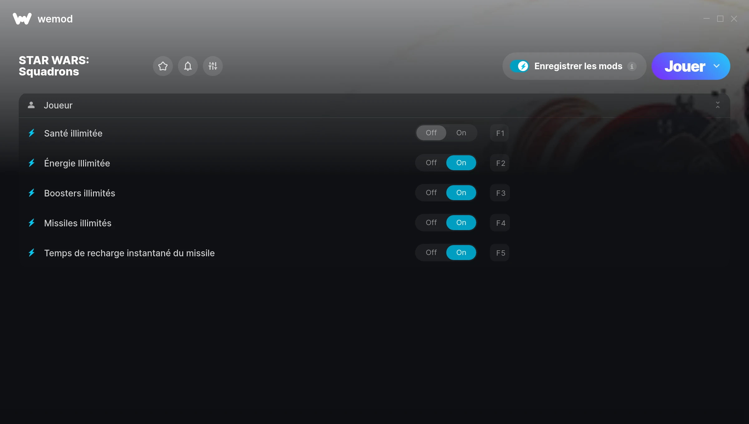 How do I use the cheats in STAR WARS: Squadrons?WeMod will safely display all of the games on your PC. Open a game from the list and simply press play. After the game loads and once you’re in-game, you can start enabling different cheats!Will this work with my game version?WeMod uses advanced technology to detect the game version you’re running and will let you know if it’s supported. If it’s not, you will still have the option of giving it a try or requesting an update!