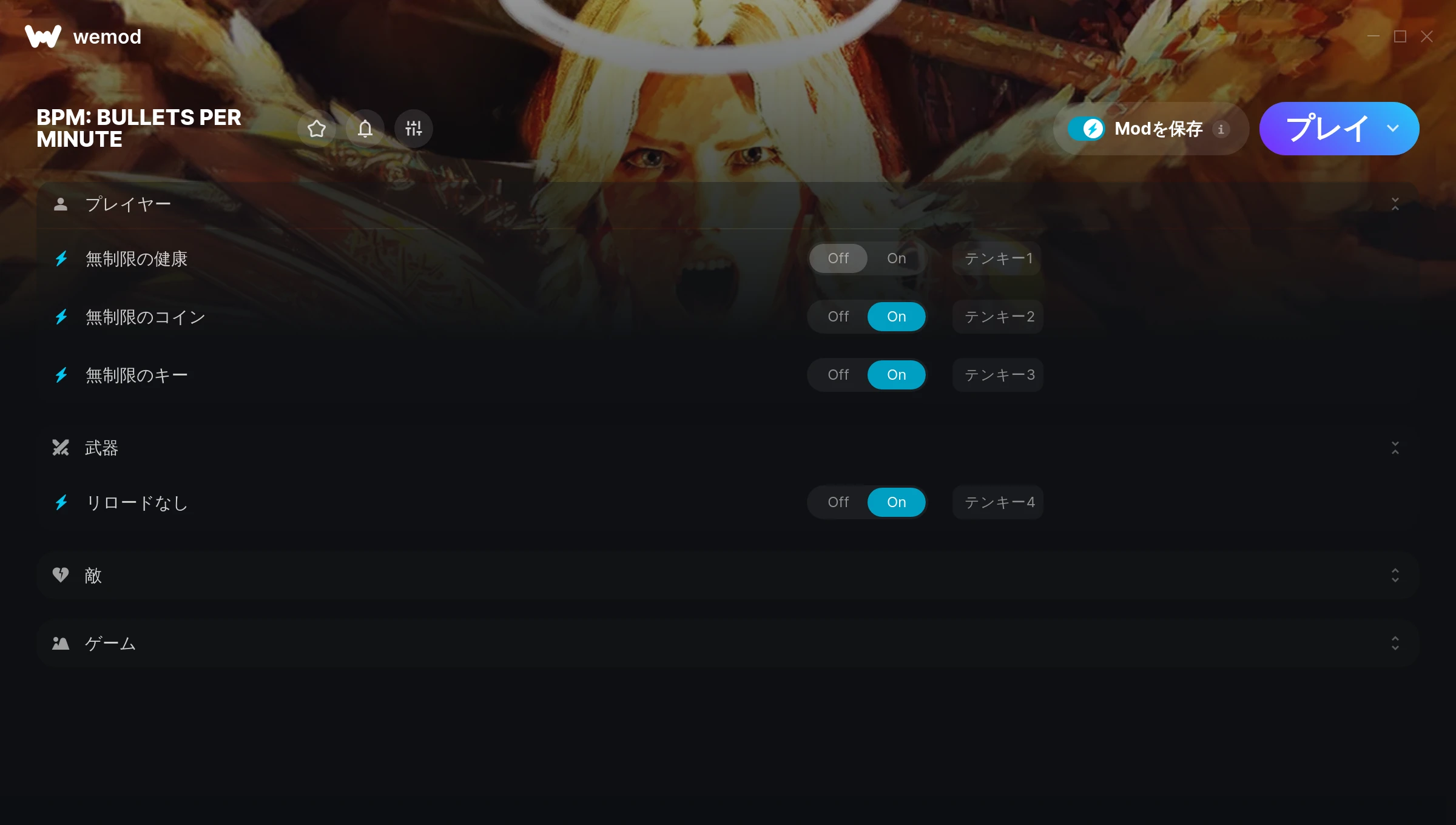 How do I use the cheats in BPM: BULLETS PER MINUTE?WeMod will safely display all of the games on your PC. Open a game from the list and simply press play. After the game loads and once you’re in-game, you can start enabling different cheats!Will this work with my game version?WeMod uses advanced technology to detect the game version you’re running and will let you know if it’s supported. If it’s not, you will still have the option of giving it a try or requesting an update!