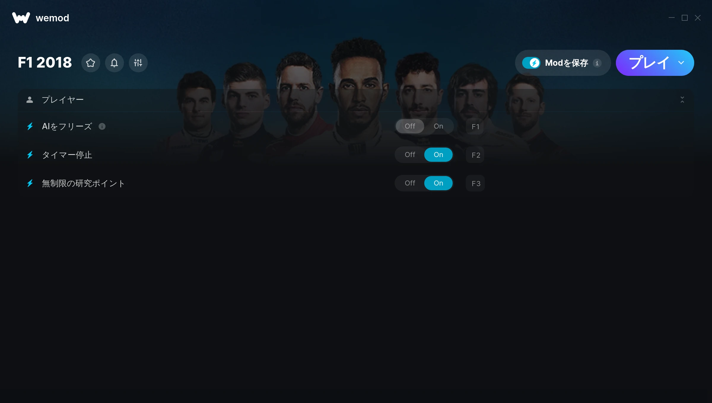 How do I use the cheats in F1 2018?WeMod will safely display all of the games on your PC. Open a game from the list and simply press play. After the game loads and once you’re in-game, you can start enabling different cheats!Will this work with my game version?WeMod uses advanced technology to detect the game version you’re running and will let you know if it’s supported. If it’s not, you will still have the option of giving it a try or requesting an update!