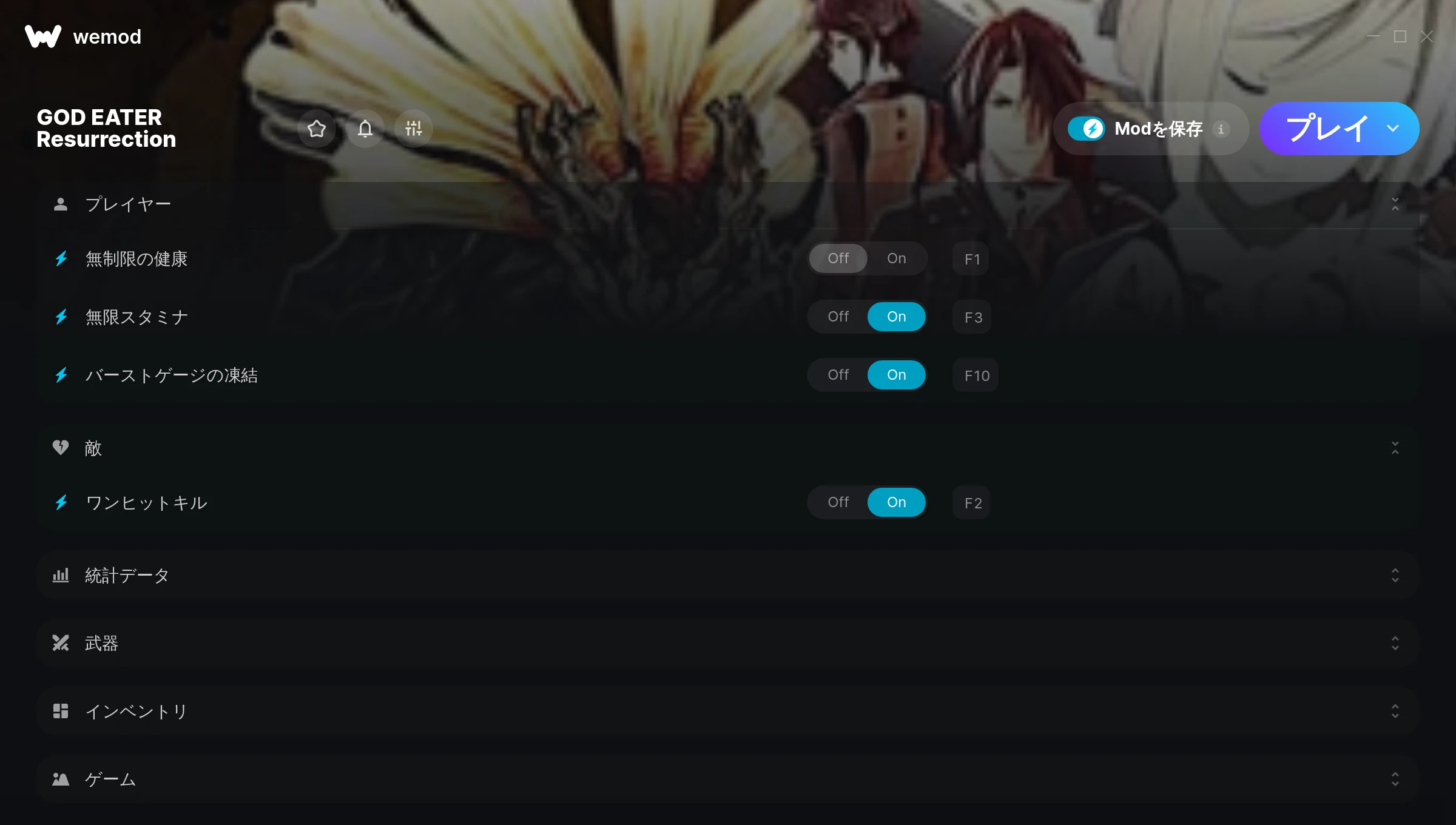 How do I use the cheats in GOD EATER Resurrection?WeMod will safely display all of the games on your PC. Open a game from the list and simply press play. After the game loads and once you’re in-game, you can start enabling different cheats!Will this work with my game version?WeMod uses advanced technology to detect the game version you’re running and will let you know if it’s supported. If it’s not, you will still have the option of giving it a try or requesting an update!