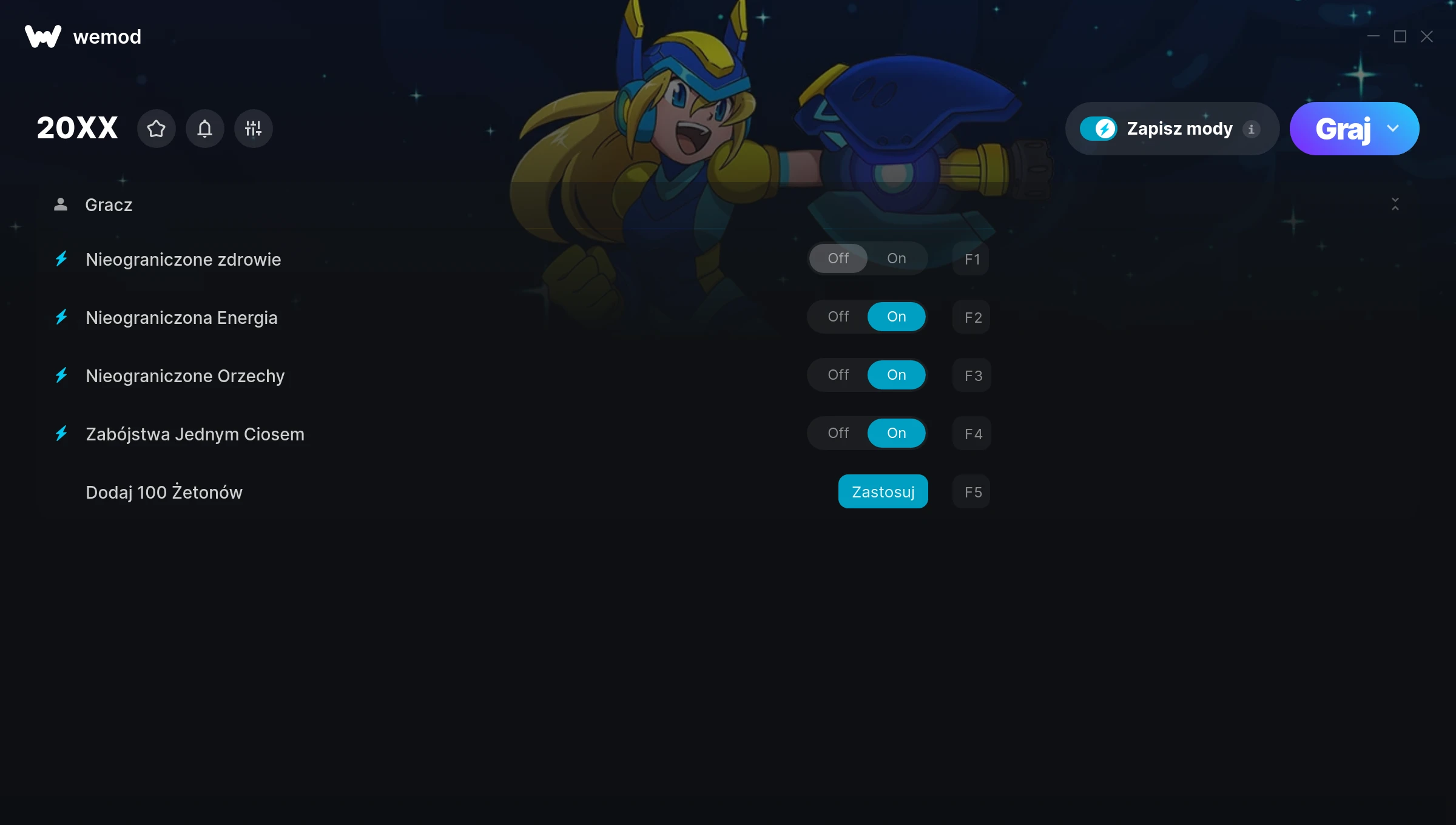 How do I use the cheats in 20XX?WeMod will safely display all of the games on your PC. Open a game from the list and simply press play. After the game loads and once you’re in-game, you can start enabling different cheats!Will this work with my game version?WeMod uses advanced technology to detect the game version you’re running and will let you know if it’s supported. If it’s not, you will still have the option of giving it a try or requesting an update!