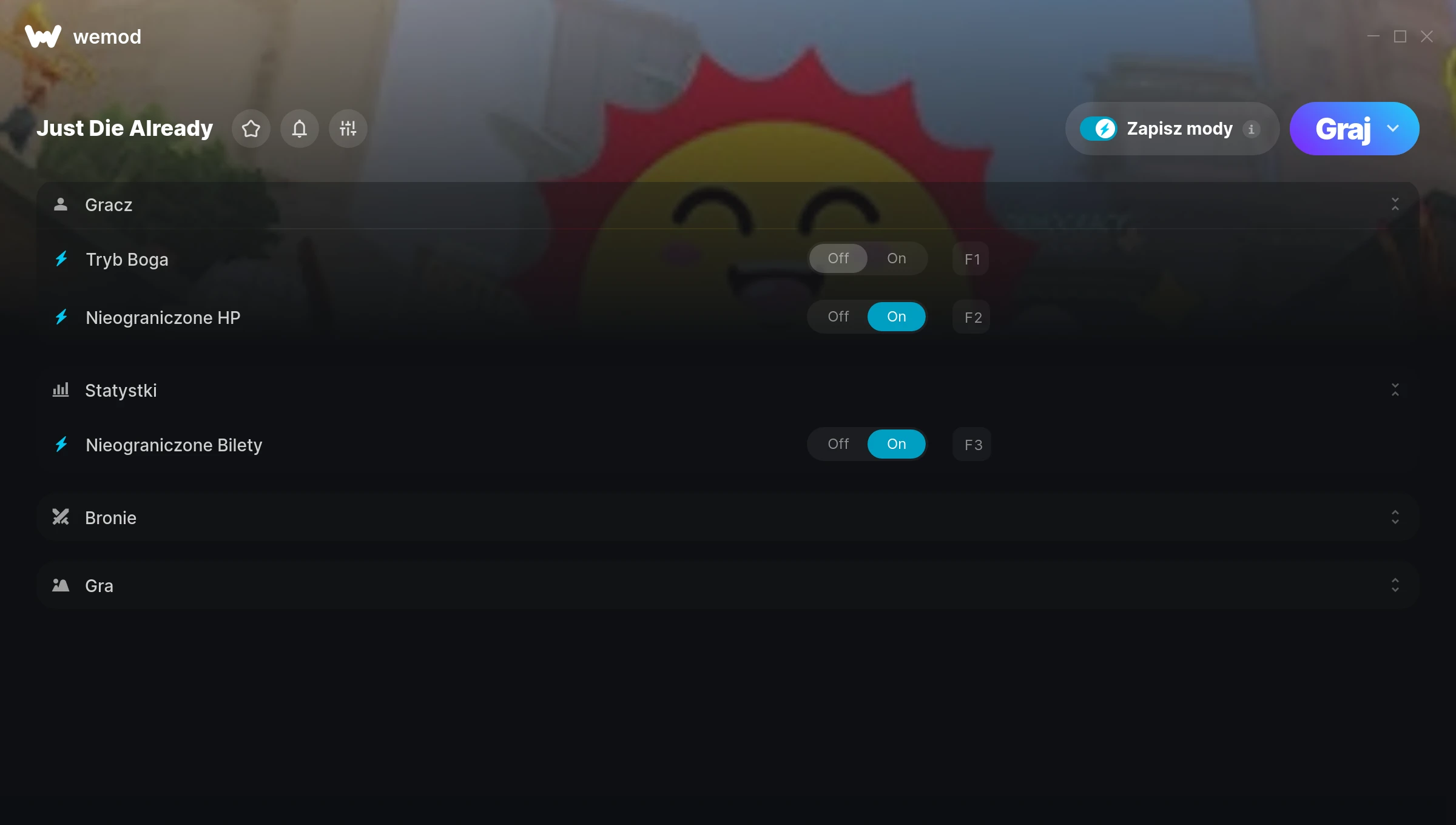How do I use the cheats in Just Die Already?WeMod will safely display all of the games on your PC. Open a game from the list and simply press play. After the game loads and once you’re in-game, you can start enabling different cheats!Will this work with my game version?WeMod uses advanced technology to detect the game version you’re running and will let you know if it’s supported. If it’s not, you will still have the option of giving it a try or requesting an update!