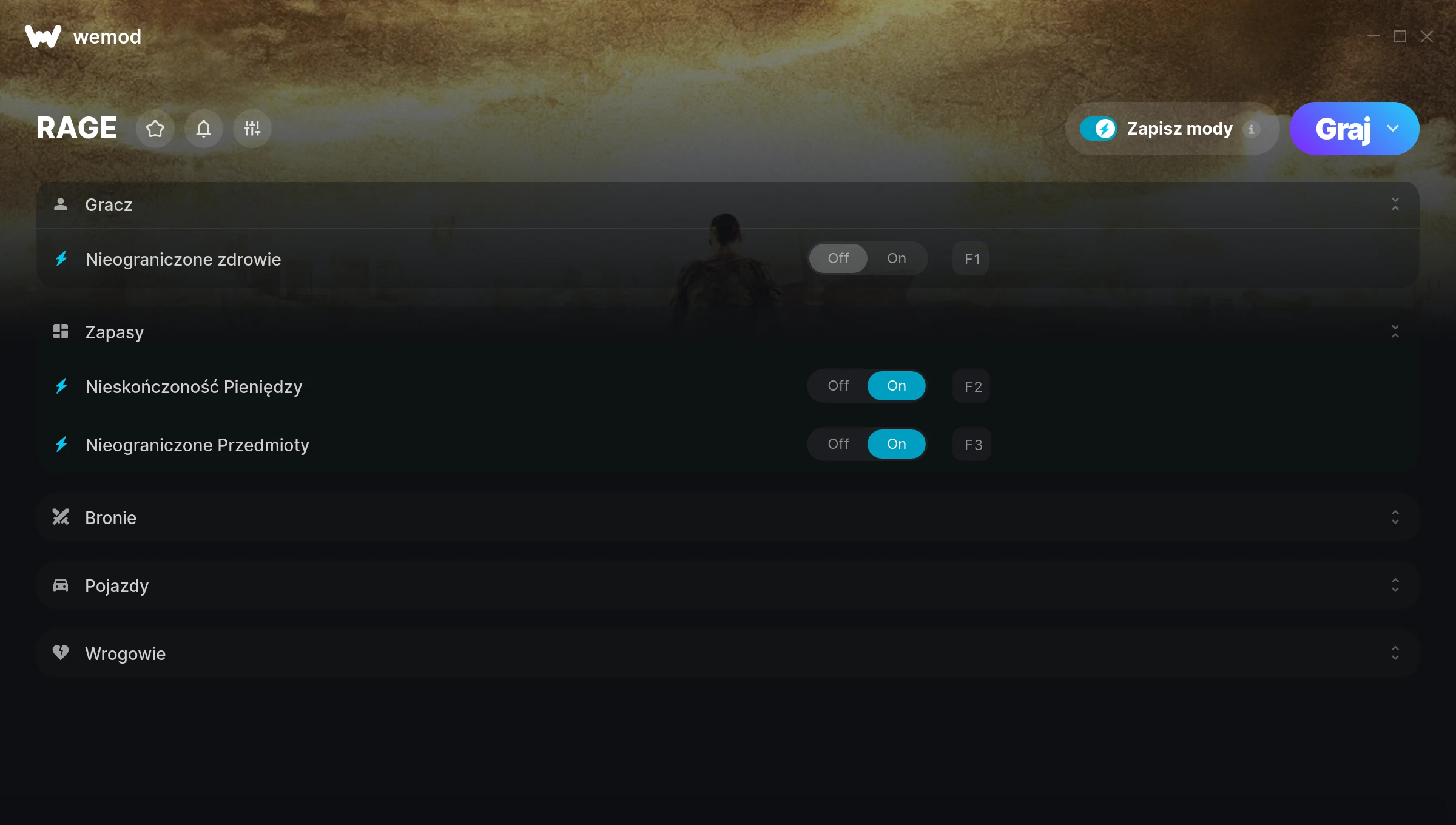 How do I use the cheats in RAGE?WeMod will safely display all of the games on your PC. Open a game from the list and simply press play. After the game loads and once you’re in-game, you can start enabling different cheats!Will this work with my game version?WeMod uses advanced technology to detect the game version you’re running and will let you know if it’s supported. If it’s not, you will still have the option of giving it a try or requesting an update!