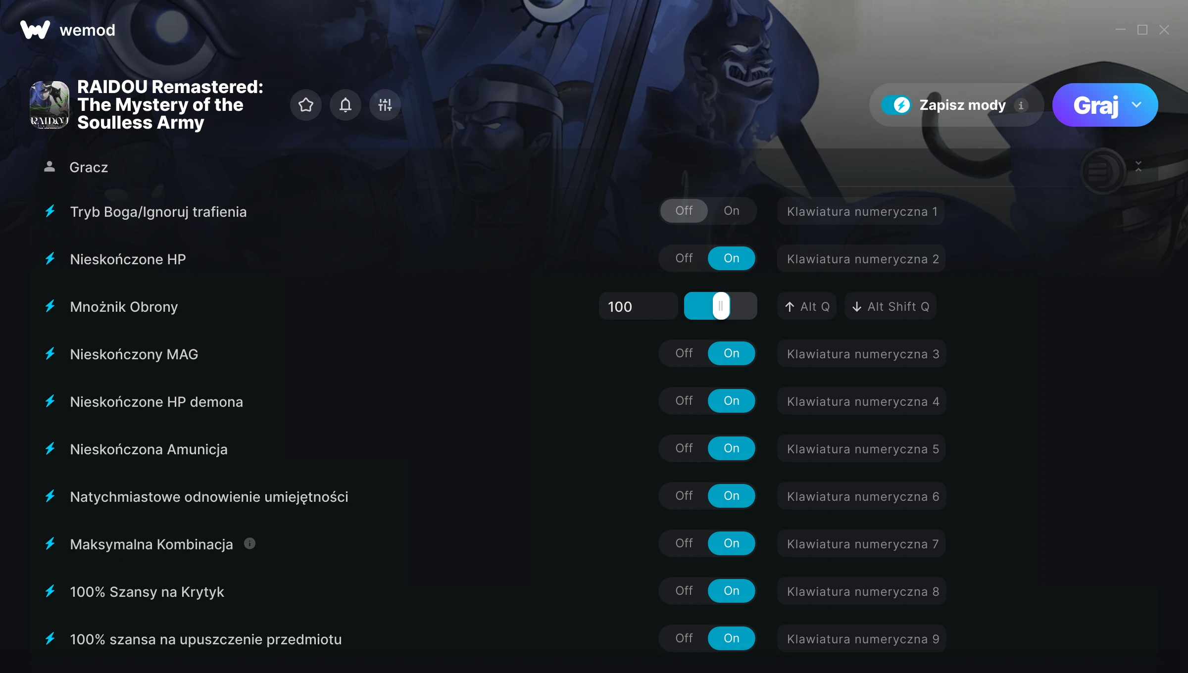 How do I use the cheats in RAIDOU Remastered: The Mystery of the Soulless Army?WeMod will safely display all of the games on your PC. Open a game from the list and simply press play. After the game loads and once you’re in-game, you can start enabling different cheats!Will this work with my game version?WeMod uses advanced technology to detect the game version you’re running and will let you know if it’s supported. If it’s not, you will still have the option of giving it a try or requesting an update!