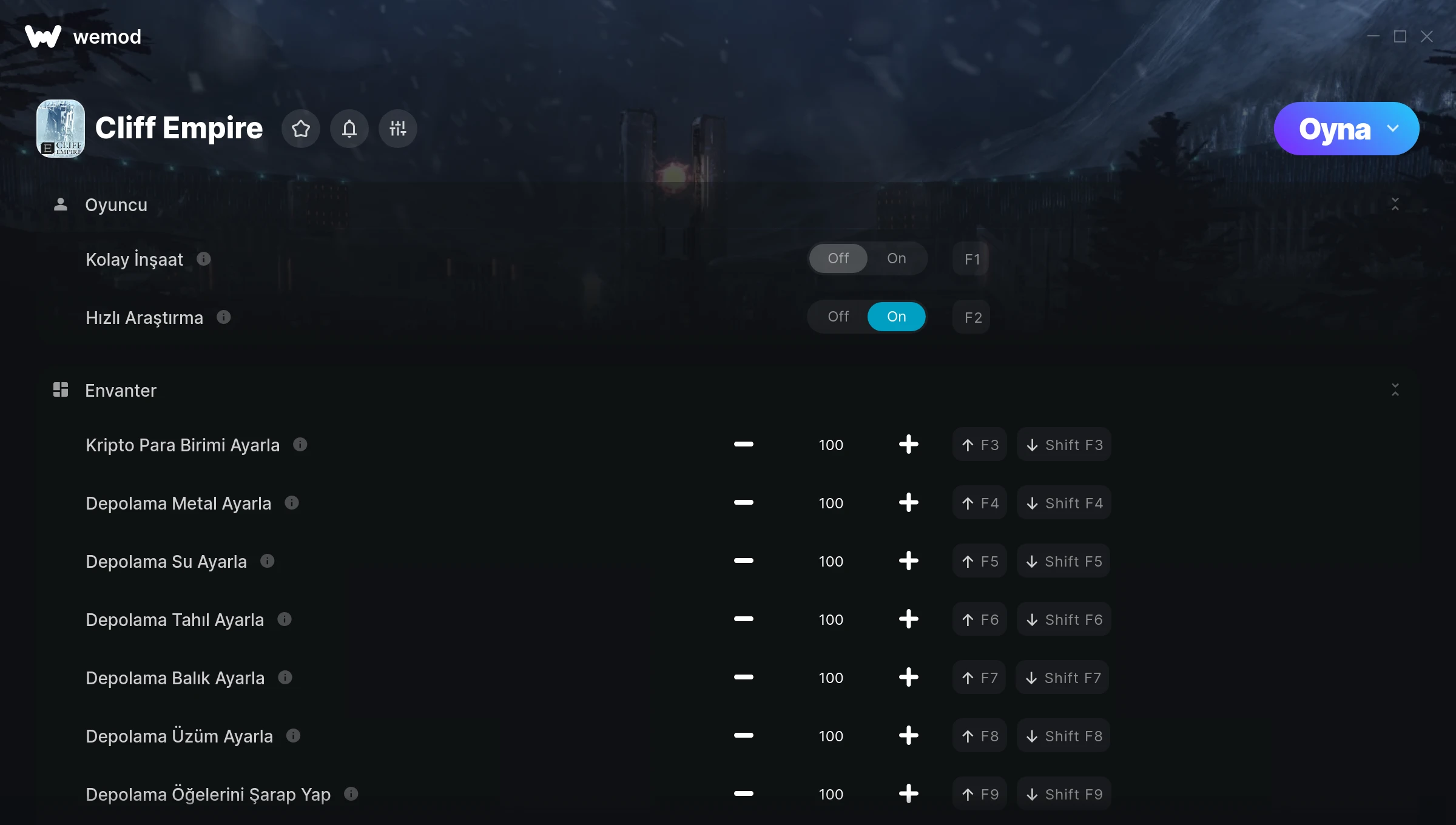 How do I use the cheats in Cliff Empire?WeMod will safely display all of the games on your PC. Open a game from the list and simply press play. After the game loads and once you’re in-game, you can start enabling different cheats!Will this work with my game version?WeMod uses advanced technology to detect the game version you’re running and will let you know if it’s supported. If it’s not, you will still have the option of giving it a try or requesting an update!