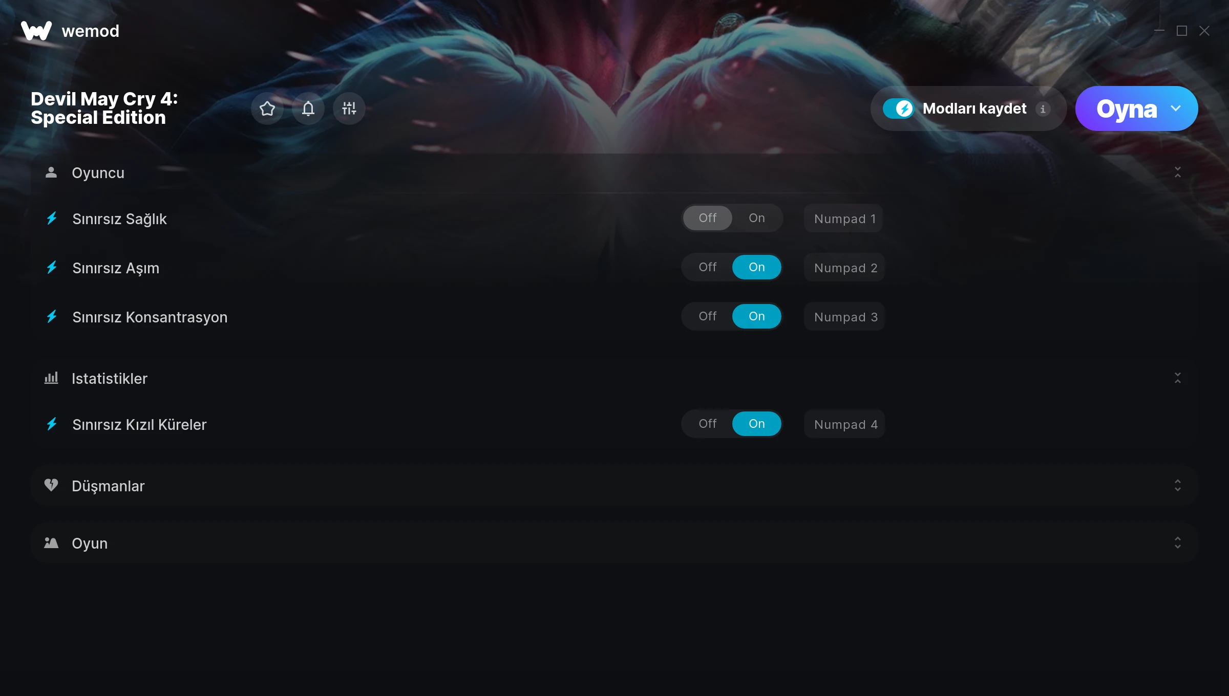 How do I use the cheats in Devil May Cry 4: Special Edition?WeMod will safely display all of the games on your PC. Open a game from the list and simply press play. After the game loads and once you’re in-game, you can start enabling different cheats!Will this work with my game version?WeMod uses advanced technology to detect the game version you’re running and will let you know if it’s supported. If it’s not, you will still have the option of giving it a try or requesting an update!