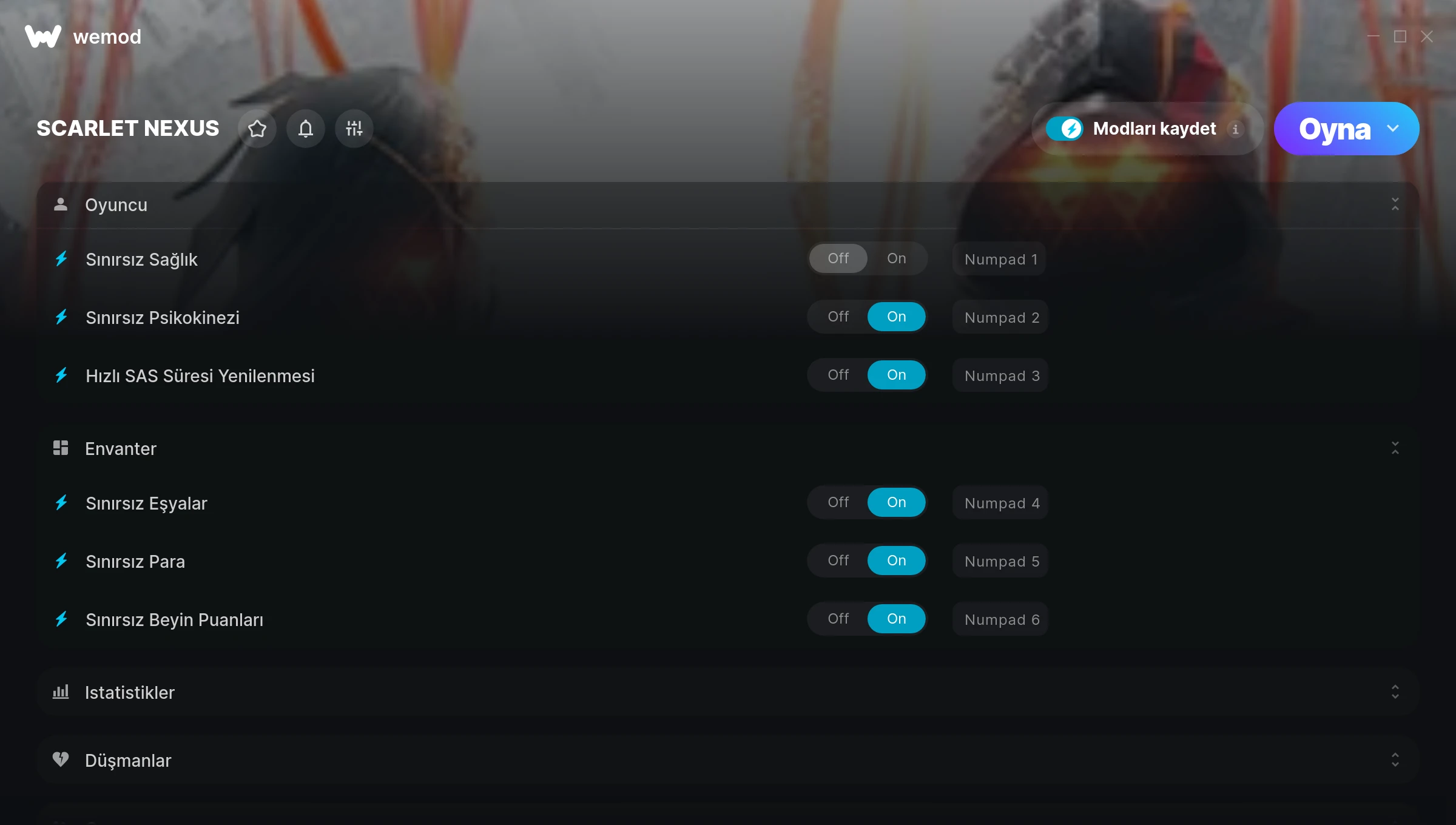 How do I use the cheats in SCARLET NEXUS?WeMod will safely display all of the games on your PC. Open a game from the list and simply press play. After the game loads and once you’re in-game, you can start enabling different cheats!Will this work with my game version?WeMod uses advanced technology to detect the game version you’re running and will let you know if it’s supported. If it’s not, you will still have the option of giving it a try or requesting an update!