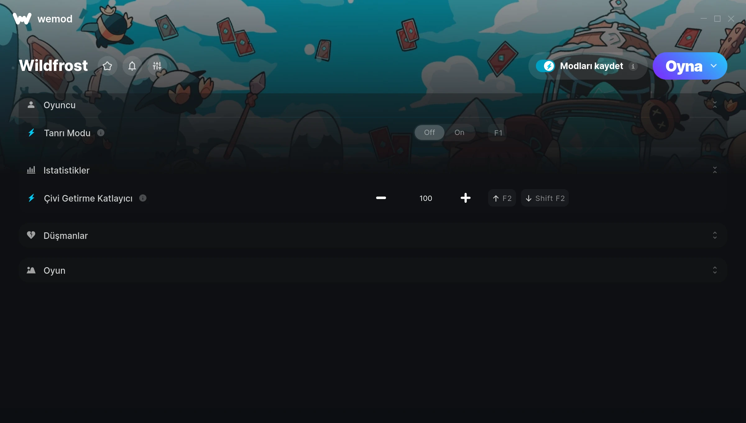 How do I use the cheats in Wildfrost?WeMod will safely display all of the games on your PC. Open a game from the list and simply press play. After the game loads and once you’re in-game, you can start enabling different cheats!Will this work with my game version?WeMod uses advanced technology to detect the game version you’re running and will let you know if it’s supported. If it’s not, you will still have the option of giving it a try or requesting an update!