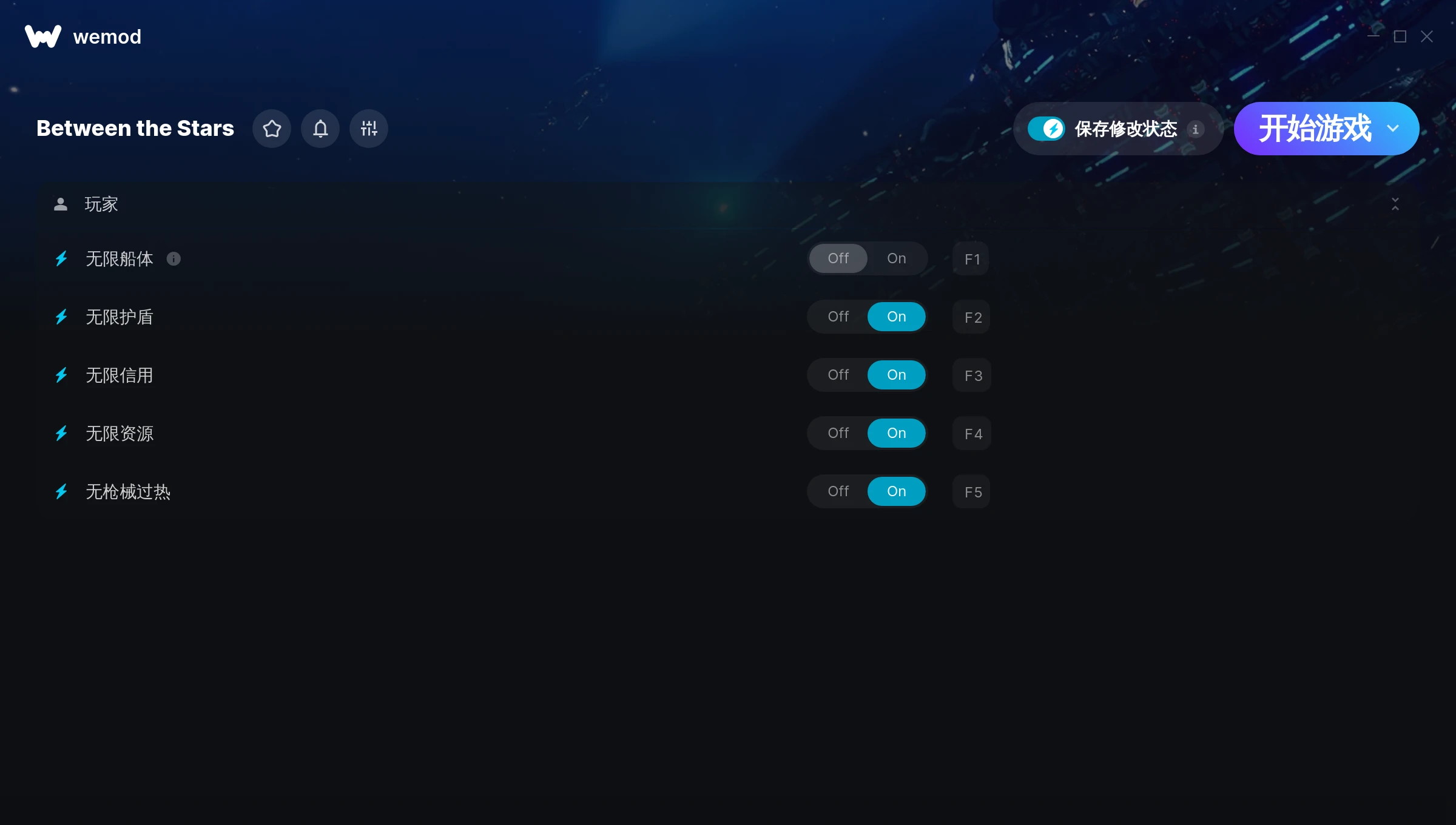How do I use the cheats in Between the Stars?WeMod will safely display all of the games on your PC. Open a game from the list and simply press play. After the game loads and once you’re in-game, you can start enabling different cheats!Will this work with my game version?WeMod uses advanced technology to detect the game version you’re running and will let you know if it’s supported. If it’s not, you will still have the option of giving it a try or requesting an update!