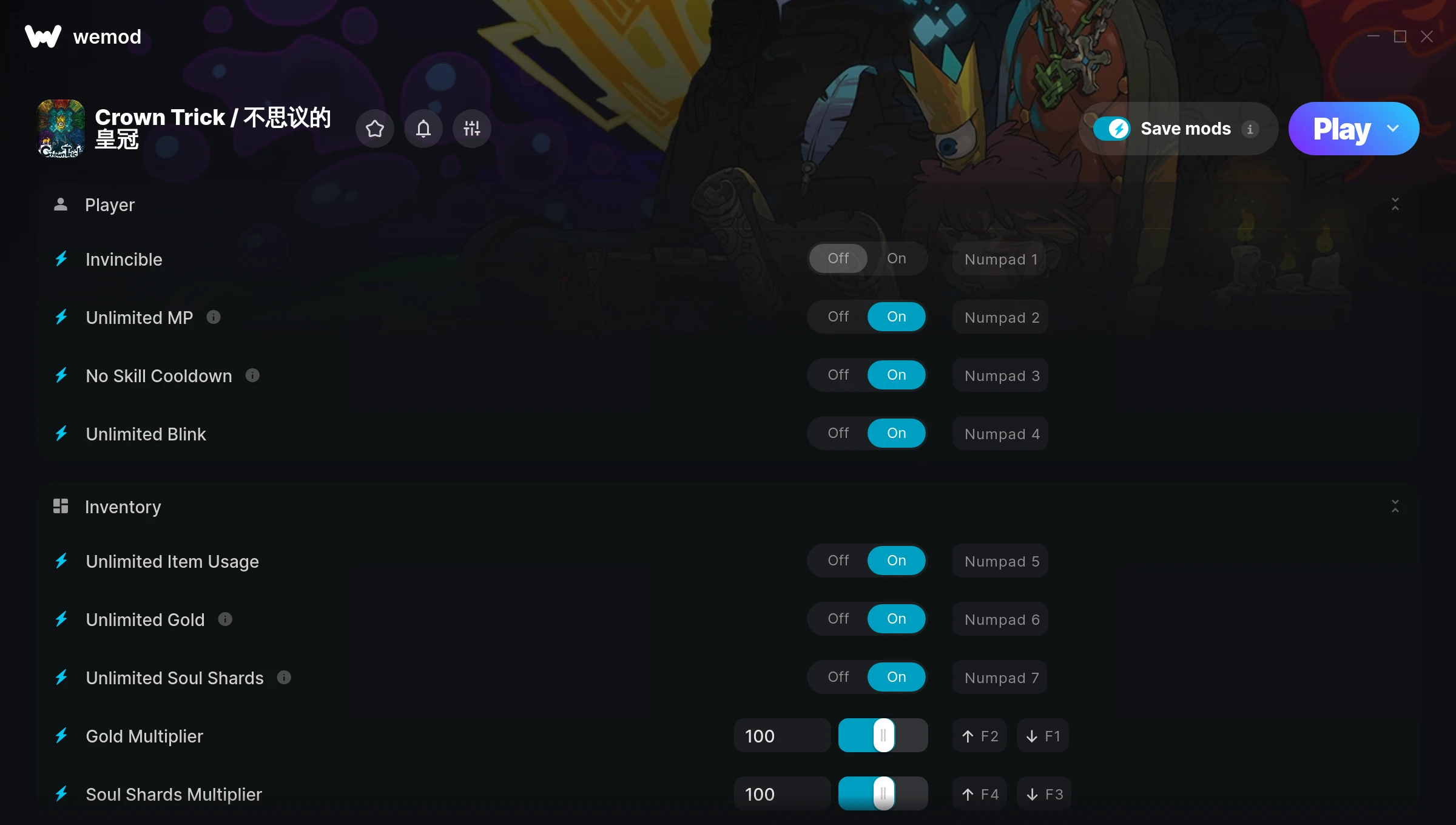 How do I use the cheats in Crown Trick / 不思议的皇冠?WeMod will safely display all of the games on your PC. Open a game from the list and simply press play. After the game loads and once you’re in-game, you can start enabling different cheats!Will this work with my game version?WeMod uses advanced technology to detect the game version you’re running and will let you know if it’s supported. If it’s not, you will still have the option of giving it a try or requesting an update!