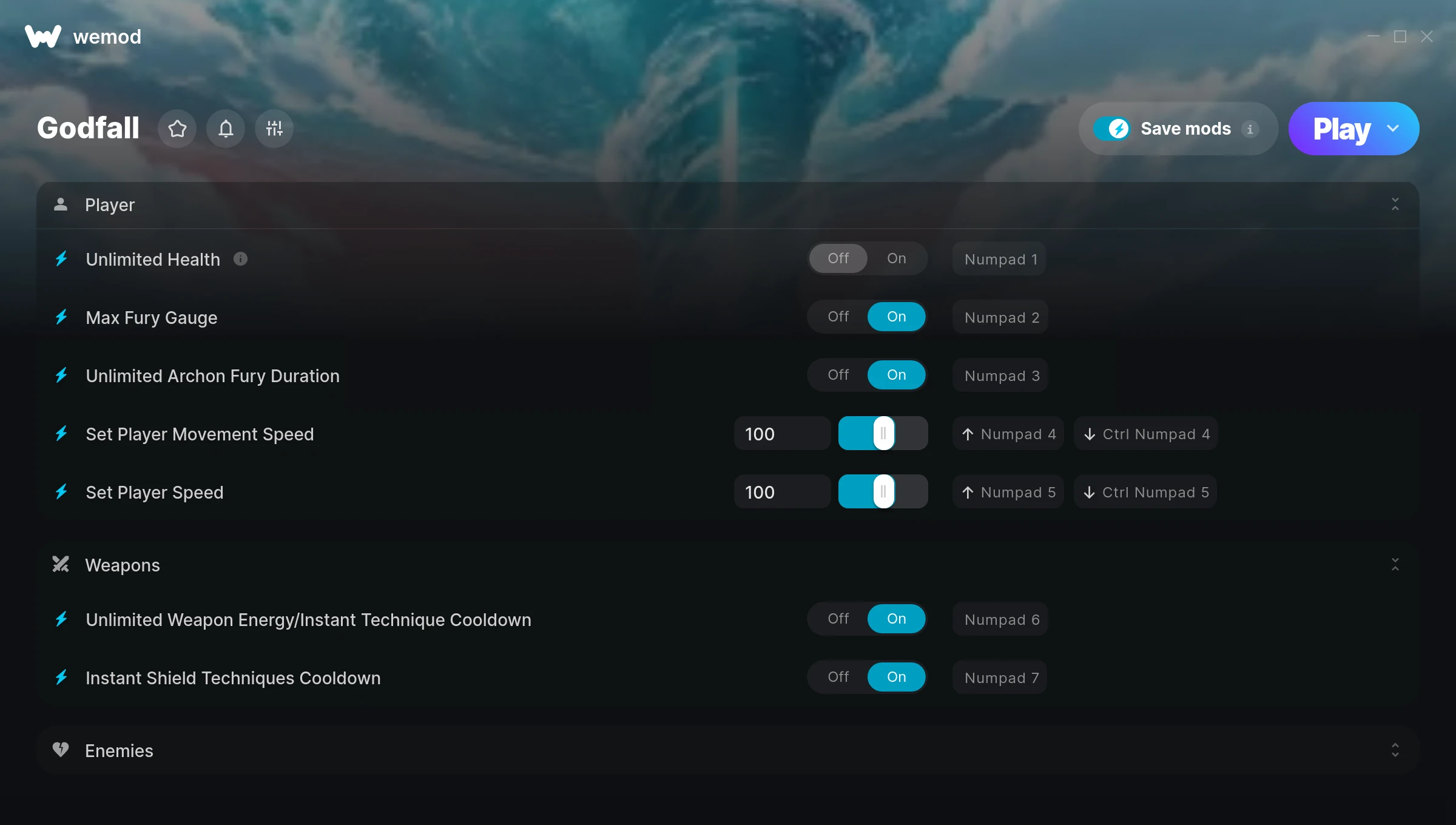 How do I use the cheats in Godfall?WeMod will safely display all of the games on your PC. Open a game from the list and simply press play. After the game loads and once you’re in-game, you can start enabling different cheats!Will this work with my game version?WeMod uses advanced technology to detect the game version you’re running and will let you know if it’s supported. If it’s not, you will still have the option of giving it a try or requesting an update!