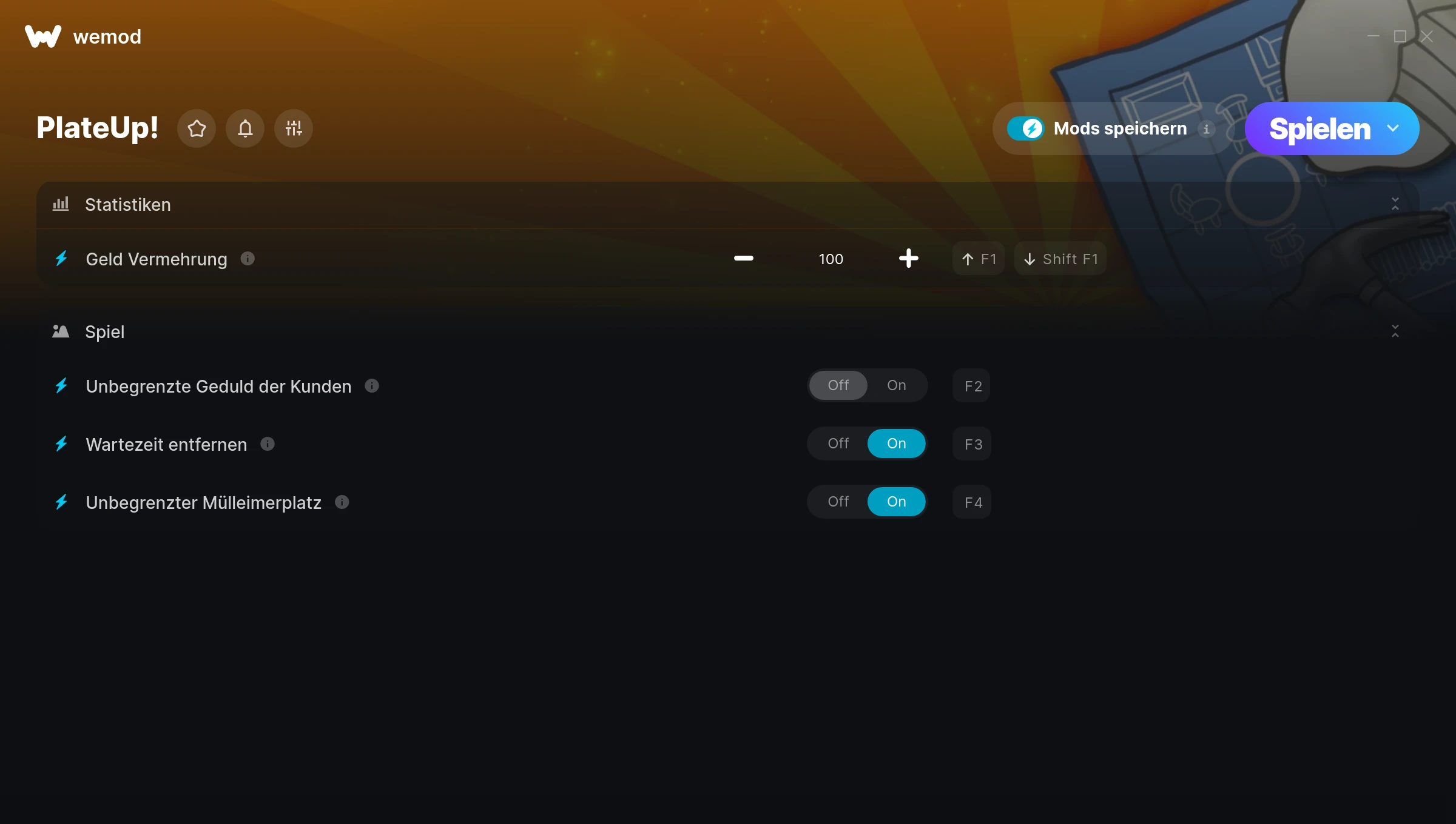 How do I use the cheats in PlateUp!?WeMod will safely display all of the games on your PC. Open a game from the list and simply press play. After the game loads and once you’re in-game, you can start enabling different cheats!Will this work with my game version?WeMod uses advanced technology to detect the game version you’re running and will let you know if it’s supported. If it’s not, you will still have the option of giving it a try or requesting an update!