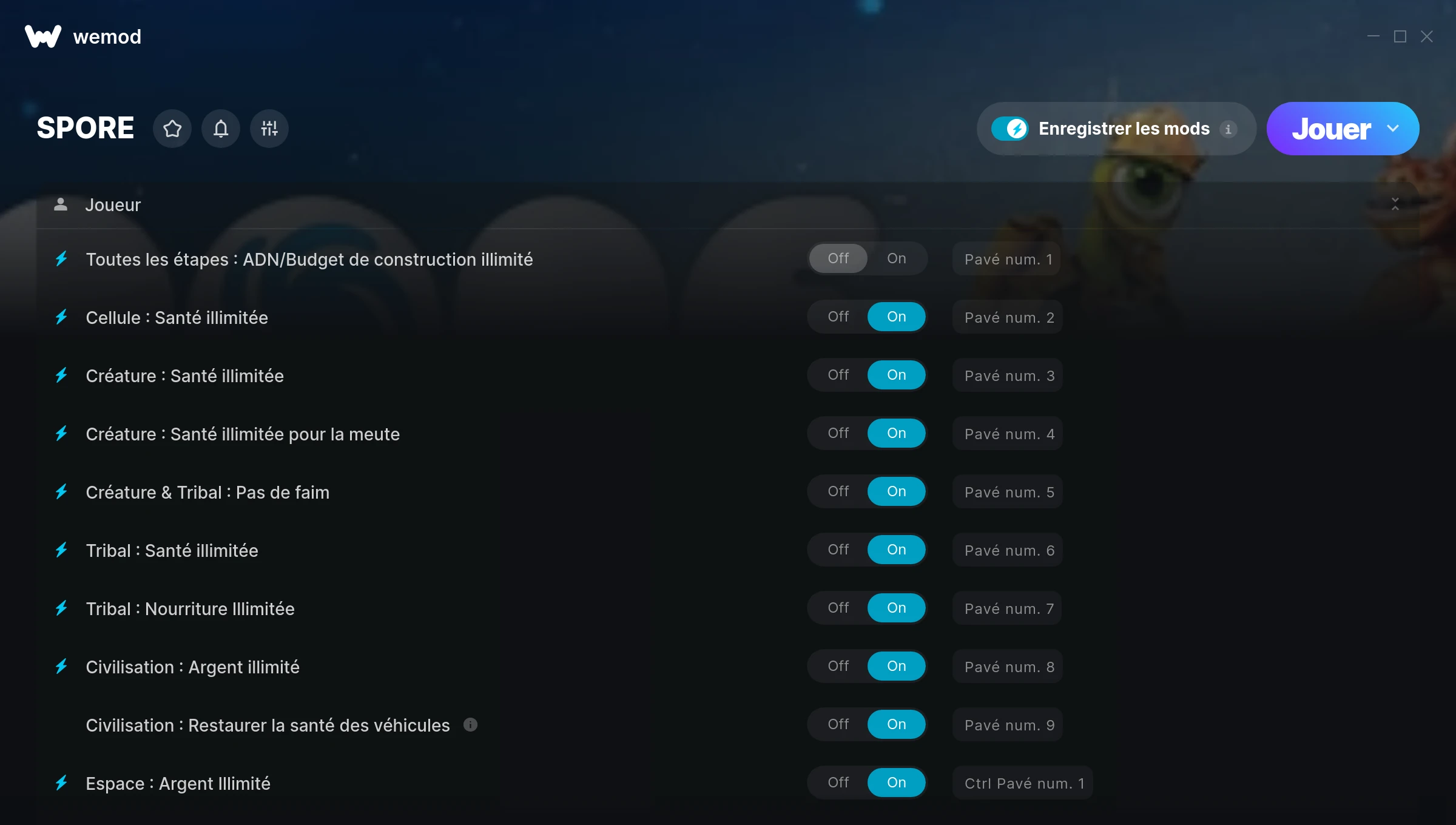 How do I use the cheats in SPORE?WeMod will safely display all of the games on your PC. Open a game from the list and simply press play. After the game loads and once you’re in-game, you can start enabling different cheats!Will this work with my game version?WeMod uses advanced technology to detect the game version you’re running and will let you know if it’s supported. If it’s not, you will still have the option of giving it a try or requesting an update!