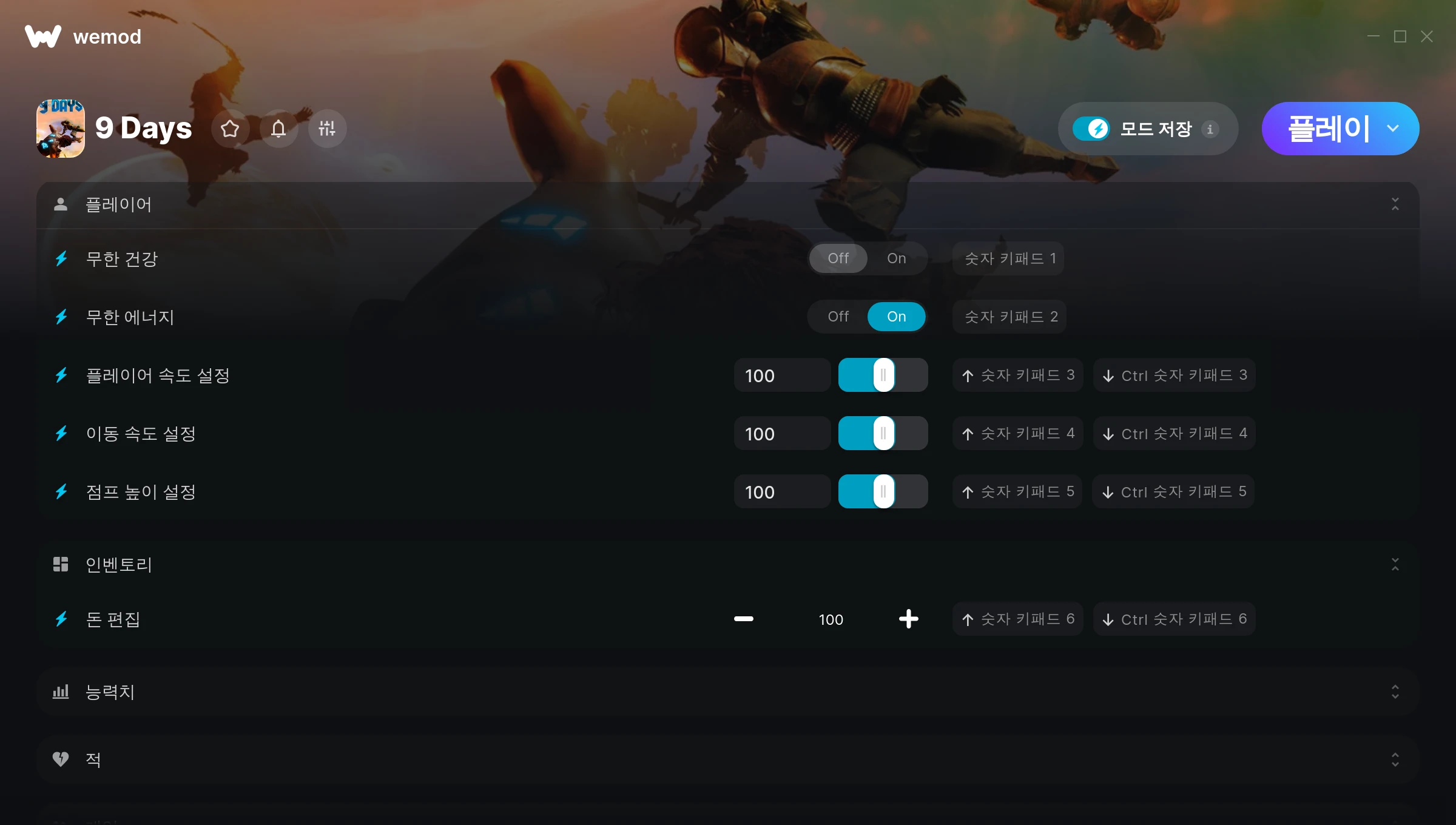How do I use the cheats in 9 Days?WeMod will safely display all of the games on your PC. Open a game from the list and simply press play. After the game loads and once you’re in-game, you can start enabling different cheats!Will this work with my game version?WeMod uses advanced technology to detect the game version you’re running and will let you know if it’s supported. If it’s not, you will still have the option of giving it a try or requesting an update!