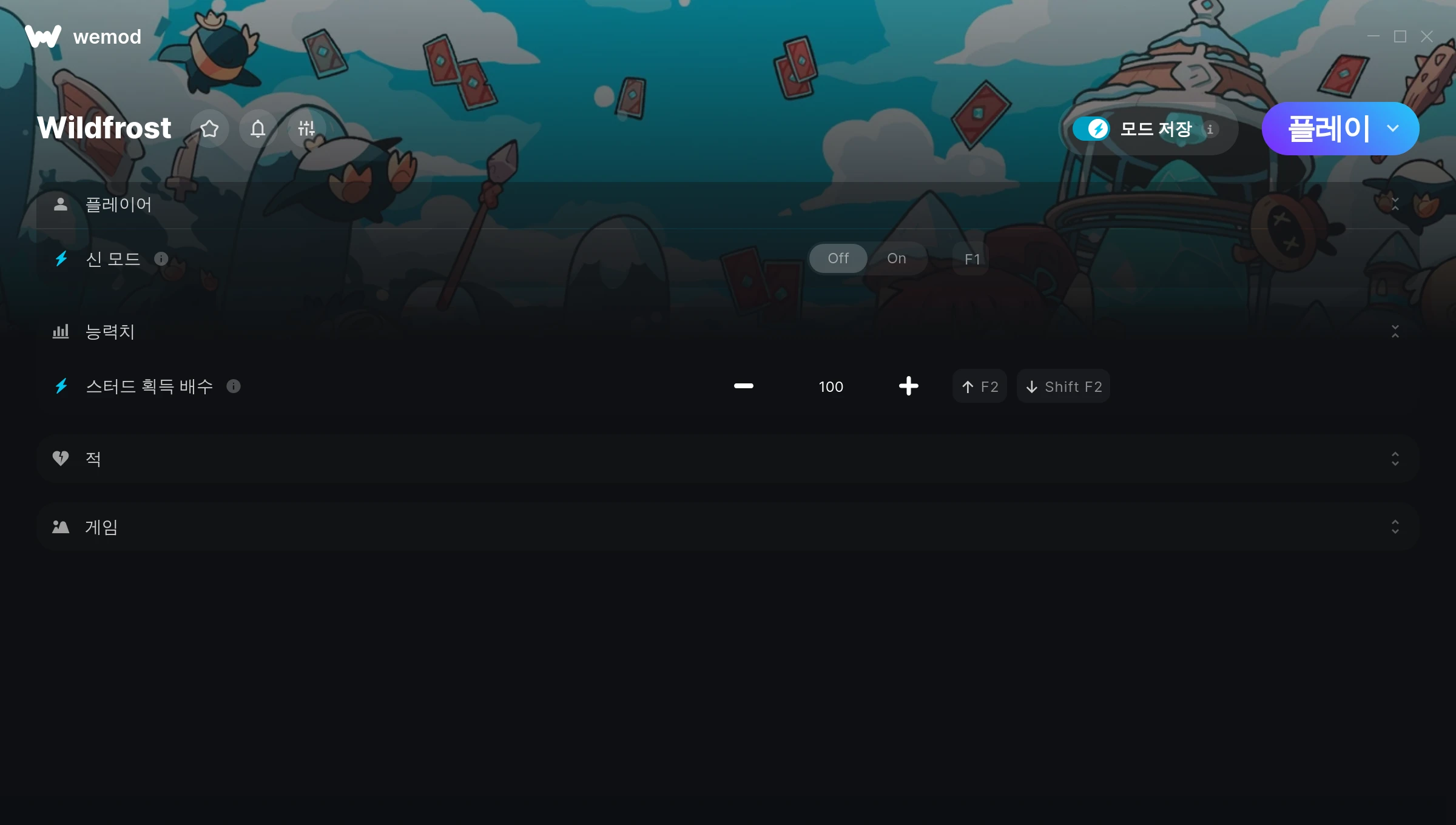 How do I use the cheats in Wildfrost?WeMod will safely display all of the games on your PC. Open a game from the list and simply press play. After the game loads and once you’re in-game, you can start enabling different cheats!Will this work with my game version?WeMod uses advanced technology to detect the game version you’re running and will let you know if it’s supported. If it’s not, you will still have the option of giving it a try or requesting an update!
